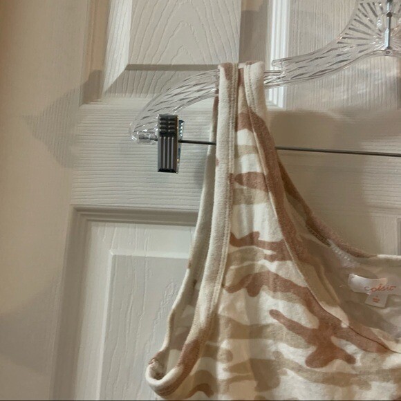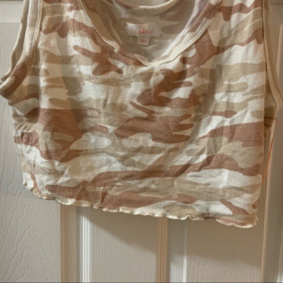 NWT Colsie Tan Camo Cozy Cropped Pajama Top Size Large. Brand new with tags. Scoop neck. Sleeveless. Cropped length. Ruffle detail hem. Was part of a 2 piece pajama set. Tank only. 76% rayon, 21% polyester, 3% spandex.