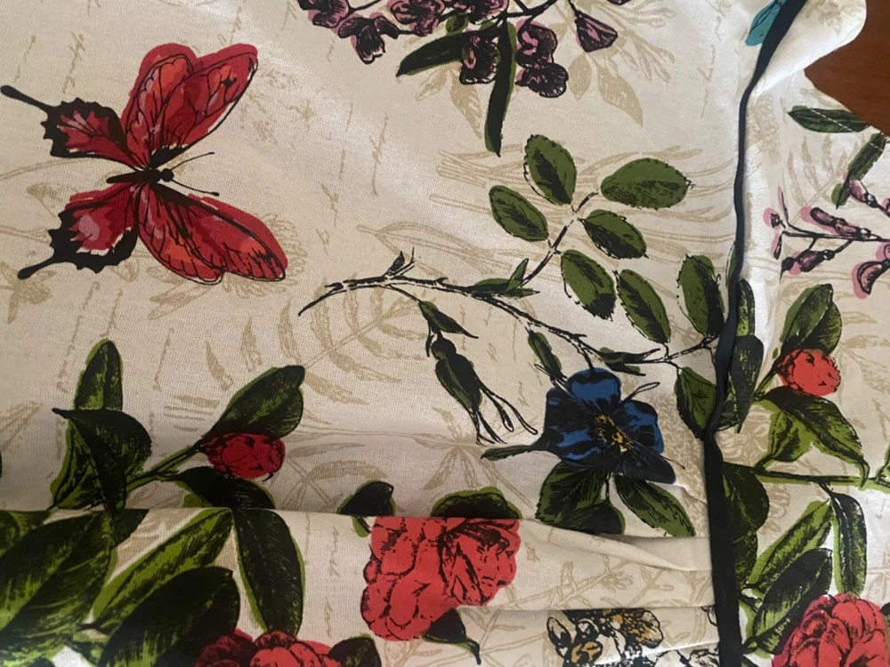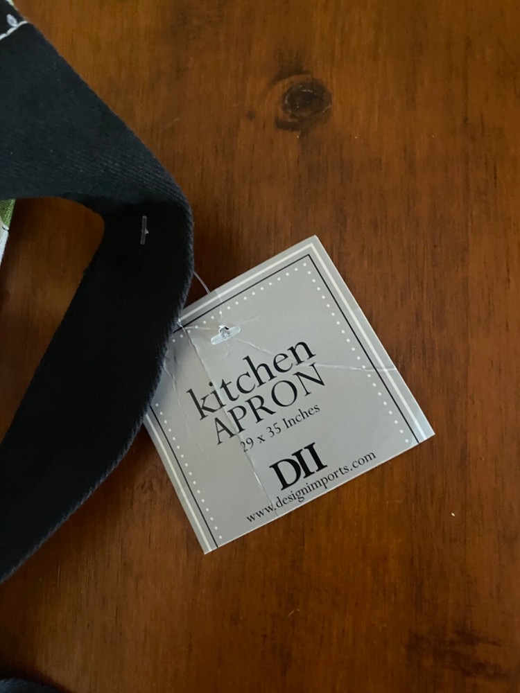 NEW WITH TAG Beautiful full apron with many floral garden features: butterflies, hummingbirds, etc. Turquoise straps at sides Black straps at top 29 x 35 " Gathered at waistline This would make a wonderful Mother's Day gift See pictures for details