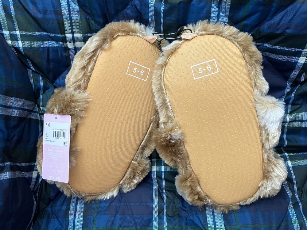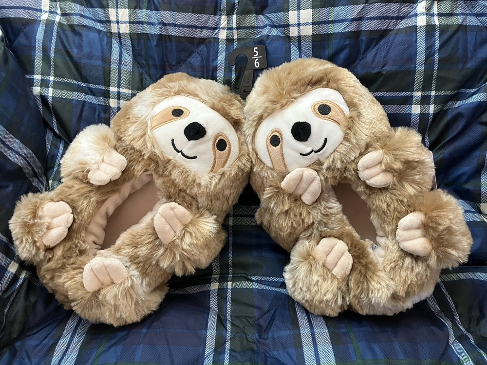 The product is a pair of Women's Sloth Slippers by Feetmoji in size 5/6. These slip-on slippers feature a cozy and comfortable design with a thick plush fabric upper. They are designed with an animal print pattern of sloths, making them a cute and stylish choice for winter, summer, fall, and spring seasons. Ideal for women looking for warmth and comfort in their footwear.