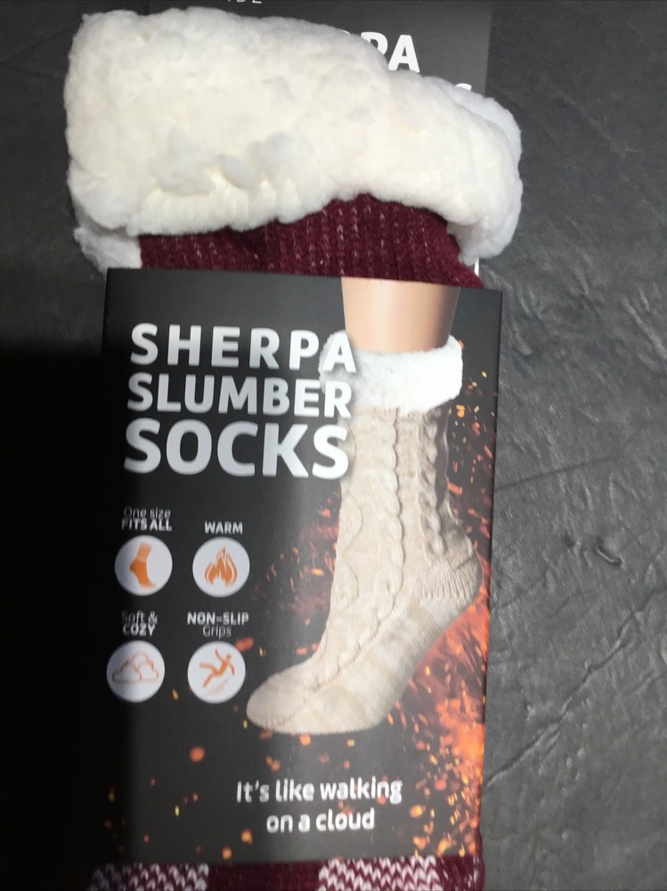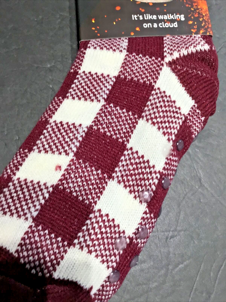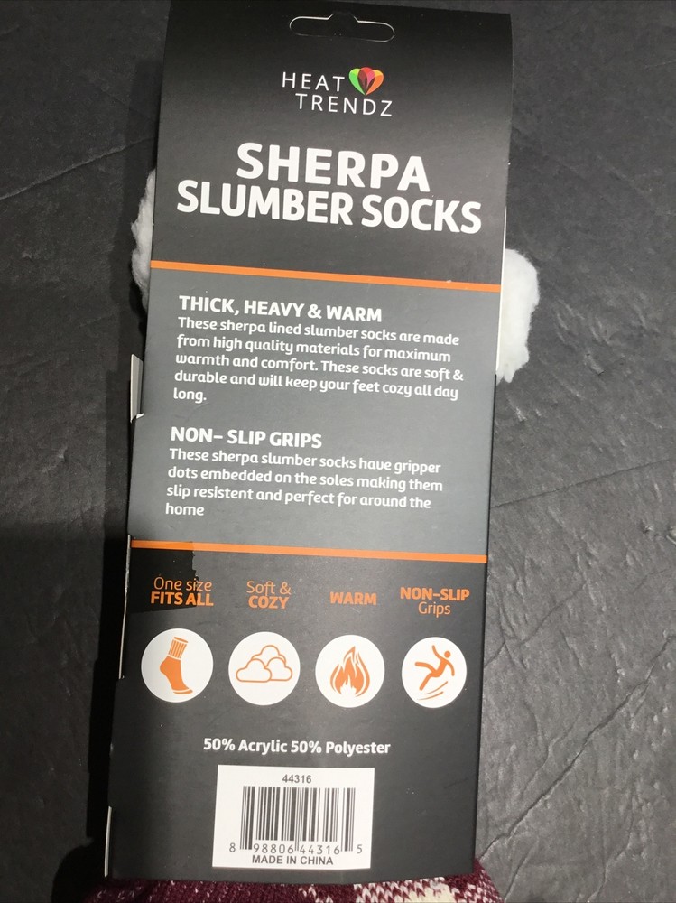 Get cozy this holiday season with these maroon Heat Trendz Sherpa Slumber Socks. Made with a soft blend of polyester and acrylic, these one-size-fits-all bed and slipper socks are perfect for lounging around the house. Non-slip features make them safe for any surface, while the snuggly winter, fall, and spring theme makes them a great gift for the holidays. These socks are versatile and perfect for leisure and sleepwear activities. From snuggling up with a book to binge-watching your favorite show, these socks will keep your feet warm and comfortable. Add them to your cart now and bring some holiday cheer to your feet. Unisex