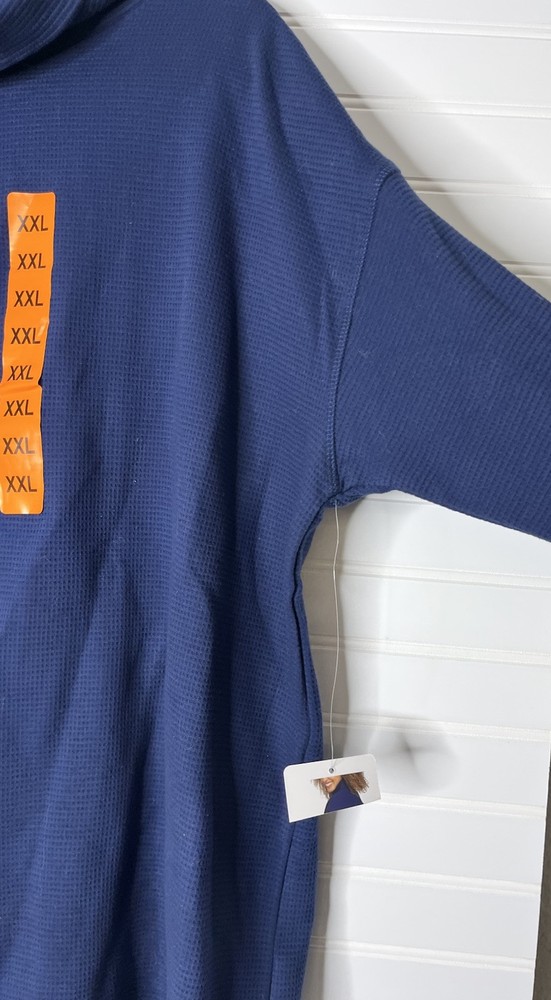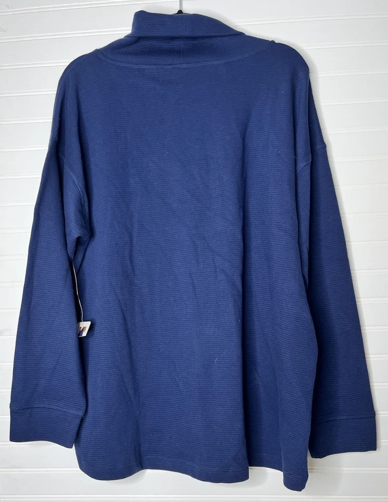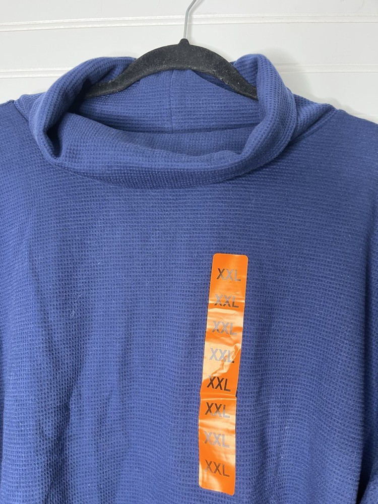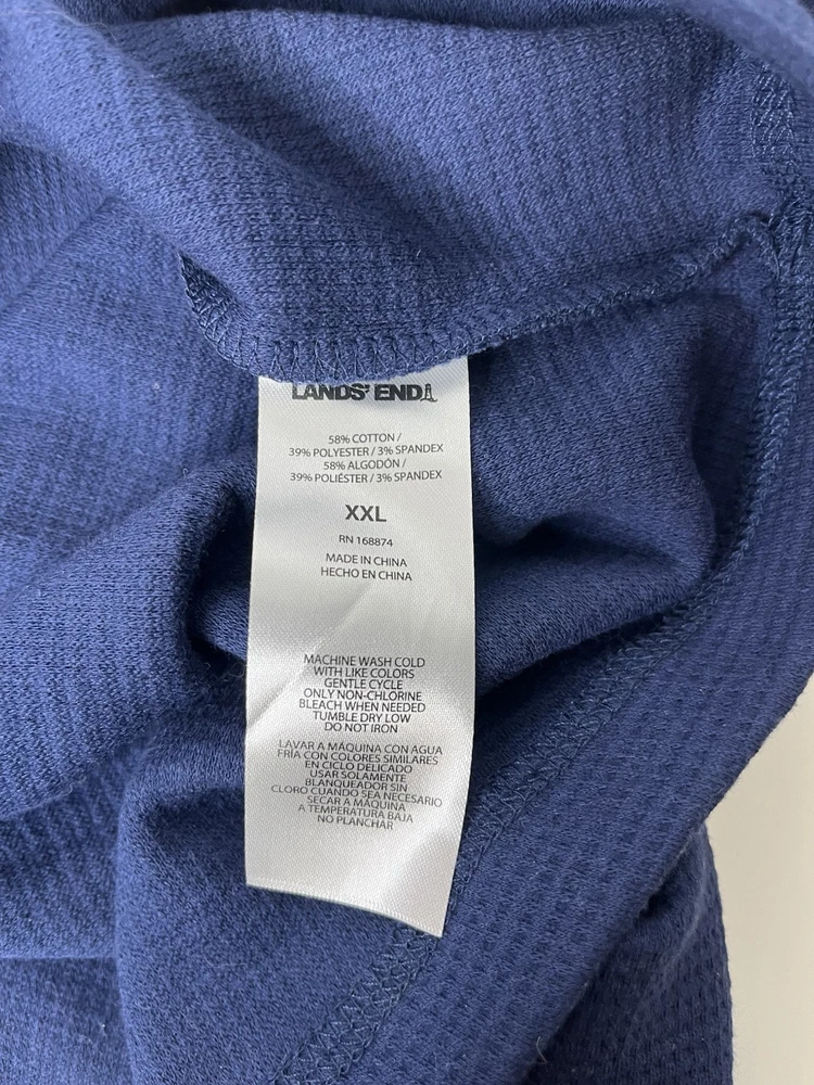 This is a cozy and classic navy blue top from Lands' End in size 2XL. It features a long sleeve design with a waffle texture and a stylish funnel neckline for added warmth and comfort. The pullover closure makes it easy to wear, and the top is suitable for casual occasions. Perfect for plus-size women looking for a comfortable and stylish addition to their wardrobe.