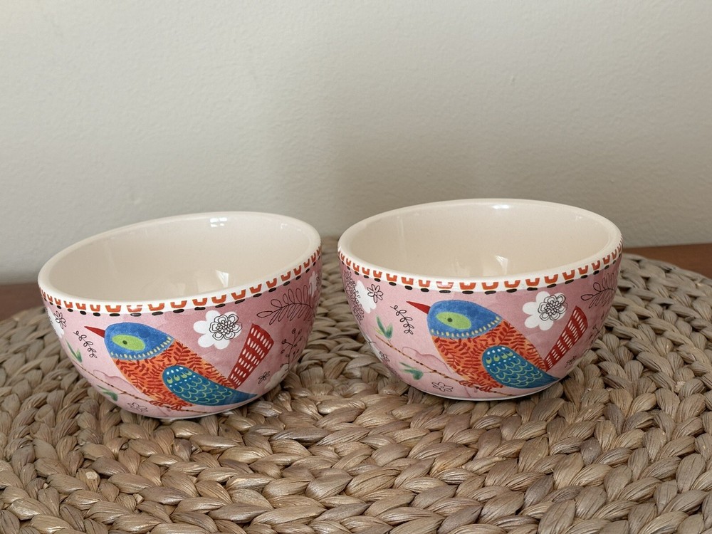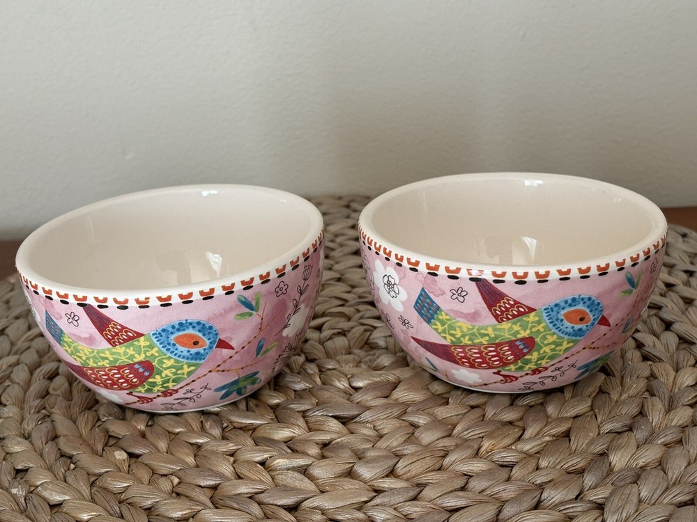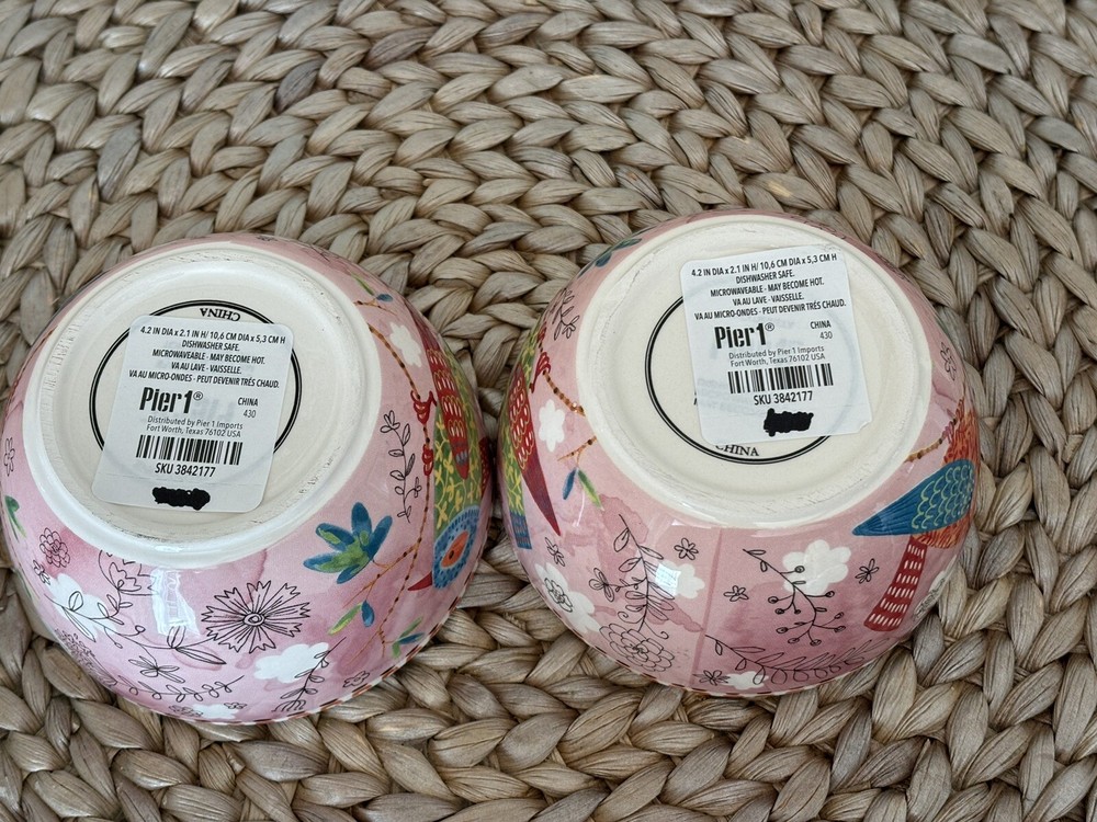 This listing is for a lot of 2 NWT Pier I Imports small bowls - pink with a floral/bird pattern - 4.2" Diameter/2.1" High....