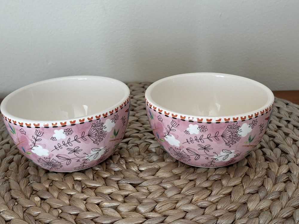 This listing is for a lot of 2 NWT Pier I Imports small bowls - pink with a floral/bird pattern - 4.2" Diameter/2.1" High.