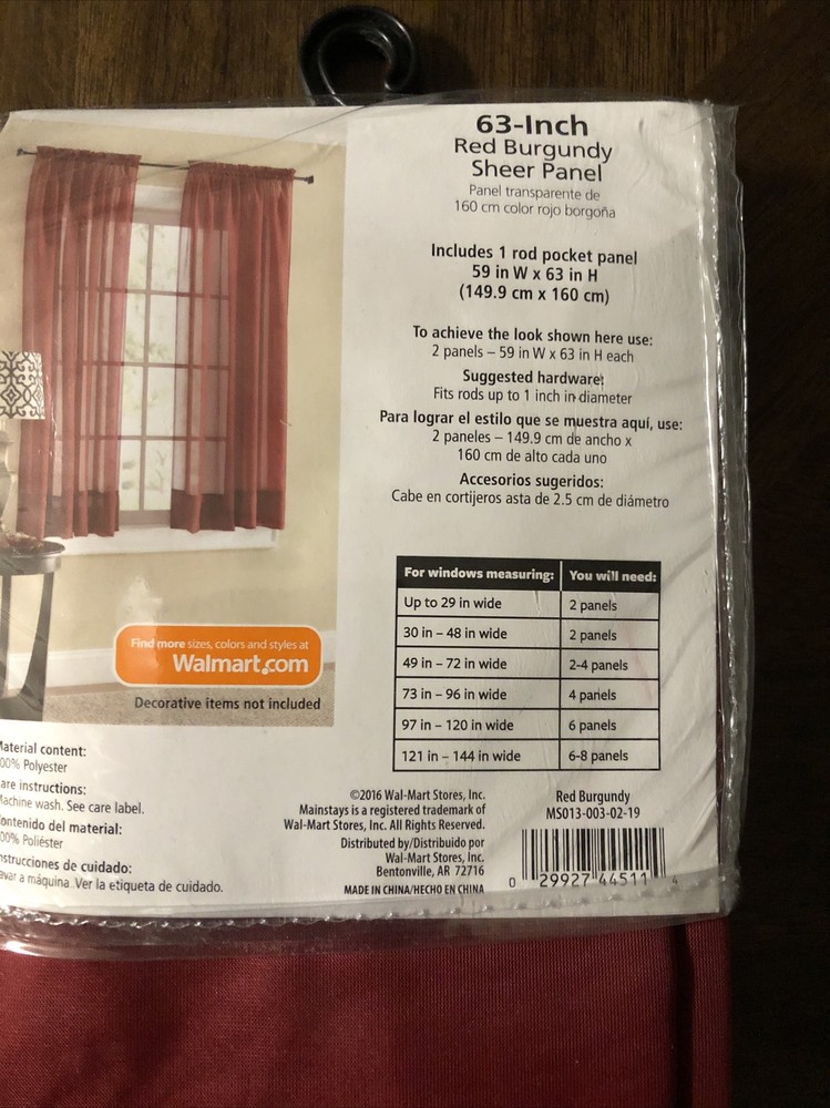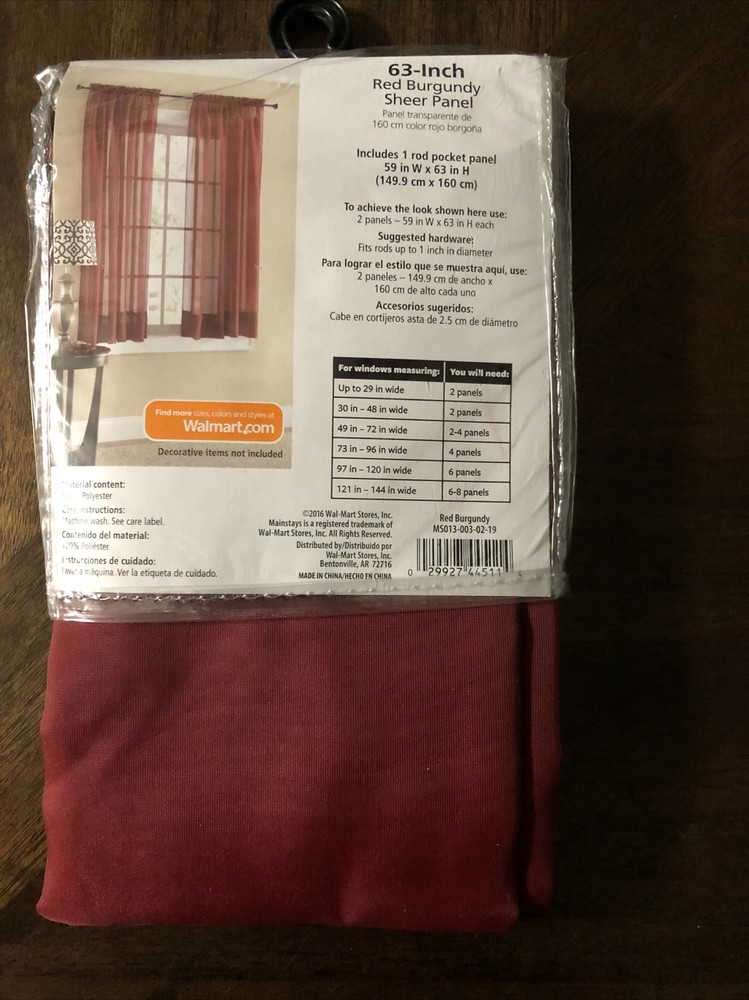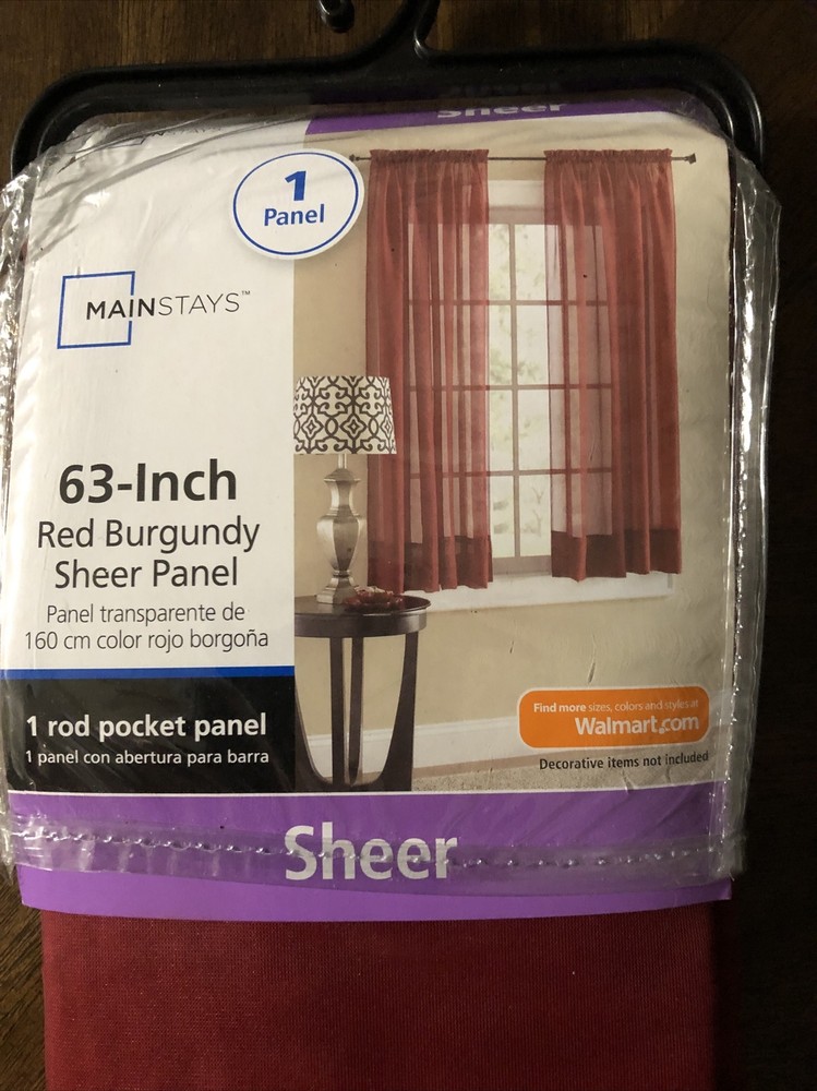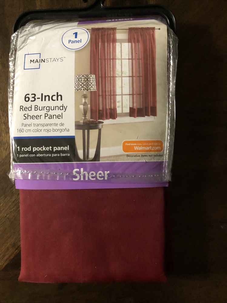 NWT Mainstays Sheer 63" L x 59" W Rod Pocket Window Curtain Panel Red Burgandy. 100% Polyester. Machine Wash. Fits rods up to 1" diameter. Condition is "New". Shipped with USPS Priority Mail.