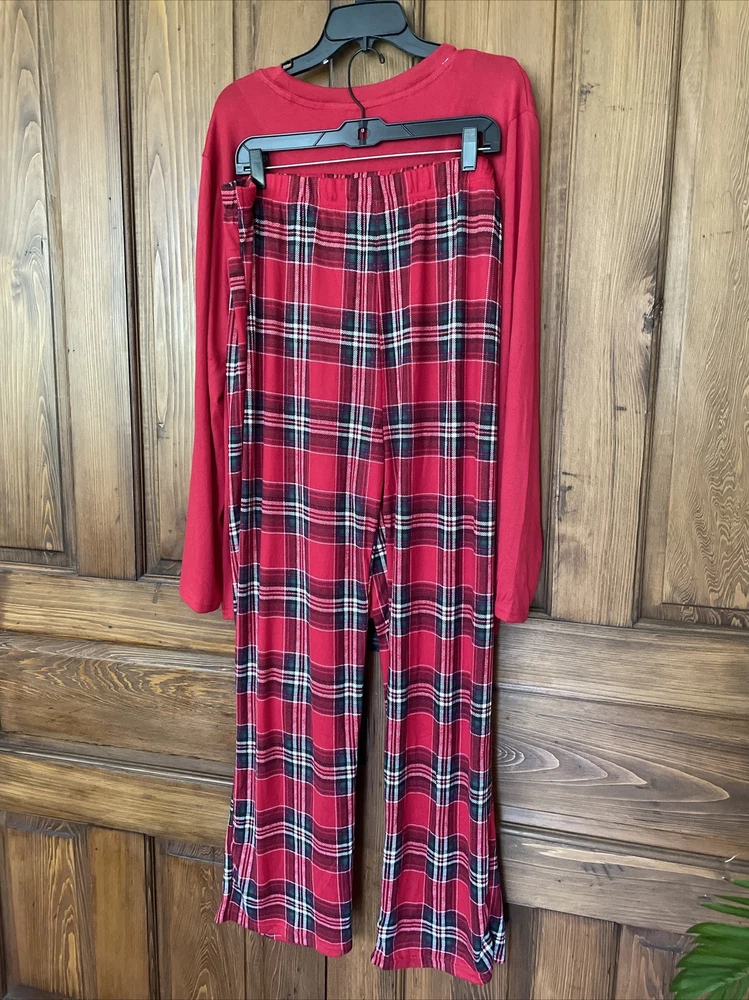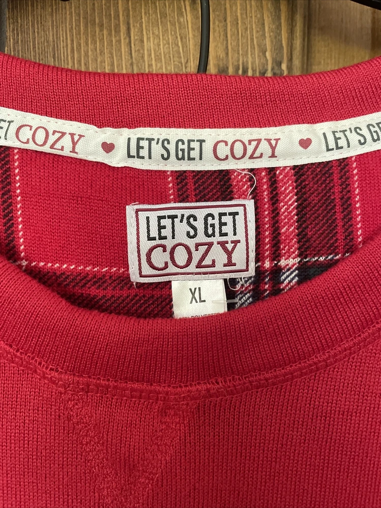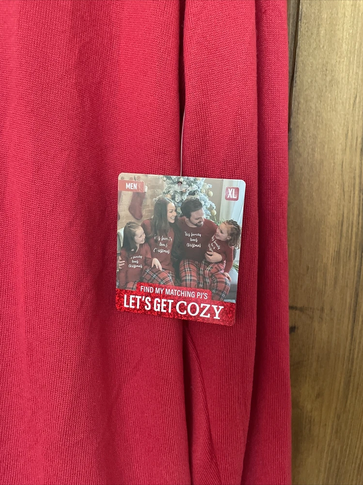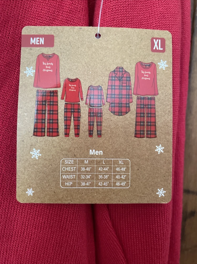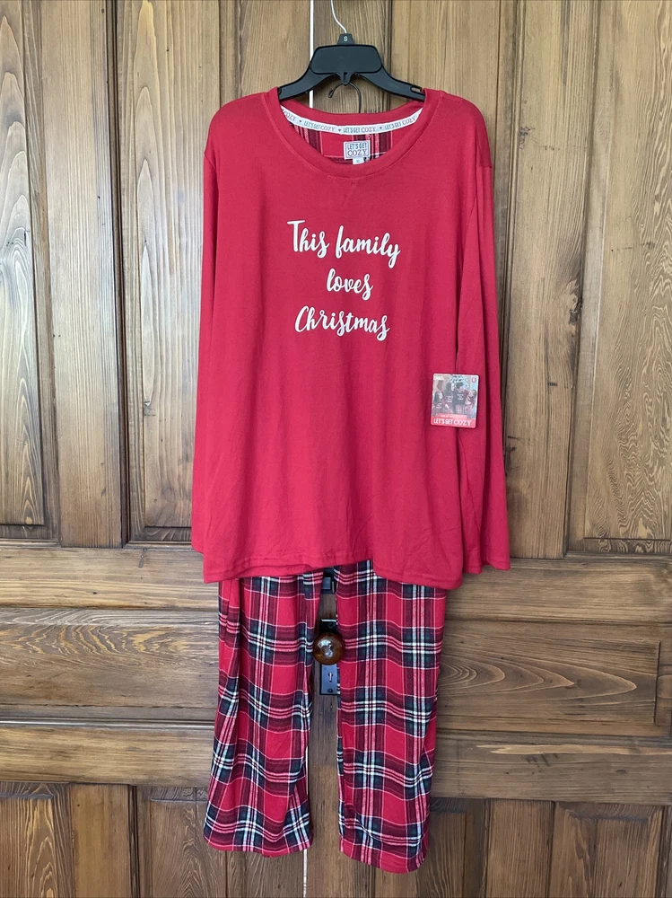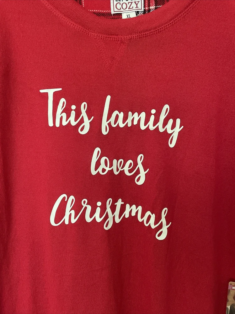 Please note two pulls on shirt at top of sleeve in pictures. Get cozy in this festive plaid pajama set perfect for the winter and fall season. The Let's Get Cozy brand brings you a comfortable and stylish pull-on design with a round neckline and long sleeves. The red polyester blend knit fabric is machine washable and features a graphic print that says "This Family Loves Christmas!" This men’s adults' pajama set is size XL and comes with a holiday theme that fits great for the season. The set is new with tags and has not been personalized or handmade. Enjoy the comfort of this Let's Get Cozy pajama set without worrying about the condition.
