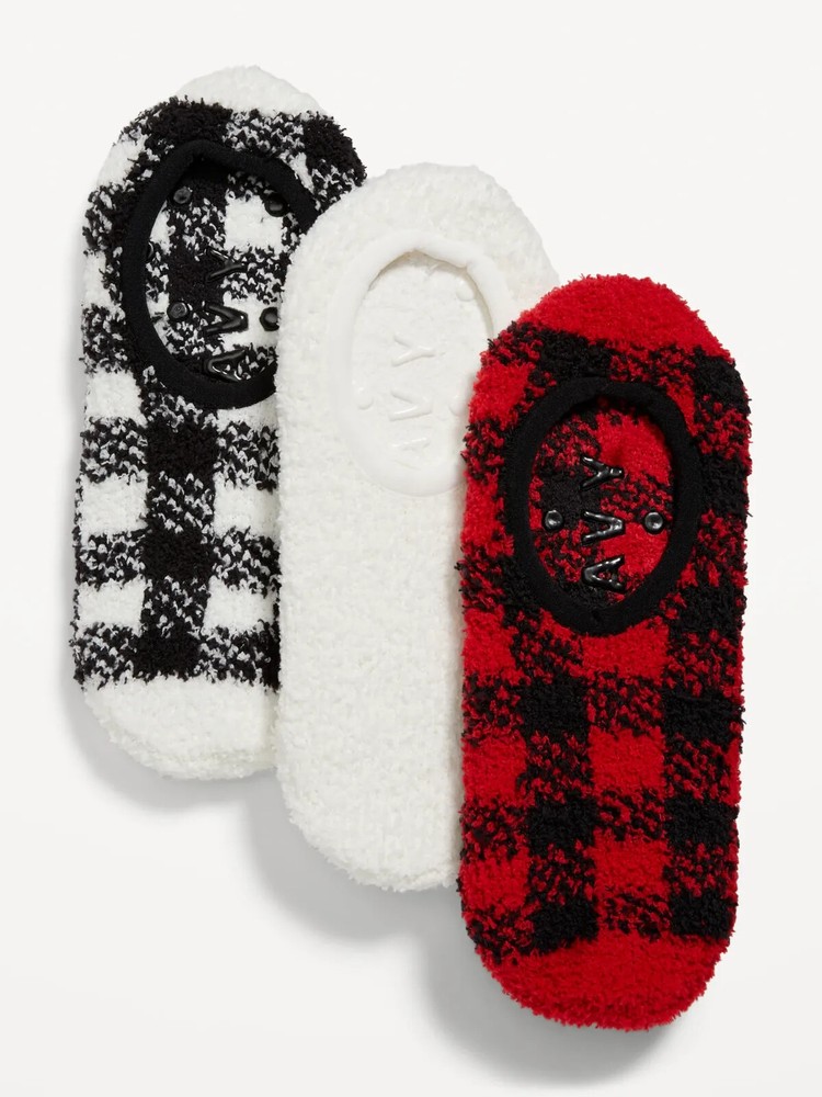 3-Pack Cozy Gripper Sneaker Socks for Women Old Navy New with Tag Color: Red Buffalo Plaid / White / Black Buffalo Plaid Size: One-Size **Smoke free / Pet free** Cozy season is officially here. And our Cozy Socks make the perfect, well, stocking stuffer. With adorable graphics, festive colors (and a won’t-break-the-bank price) you might want to pick up a pair for yourself while you’re at it.🧦 Product details: Rib-knit foot openings. Soft, plush chenille, with comfortable stretch. Pack includes 3-pairs of cozy socks in different graphics/prints vary by color. Textured vinyl logo and gripper dots at sole. Materials & Care: 99% polyester, 1% spandex Machine wash cold, tumble dry low. Imported. Fit & Sizing: One size.