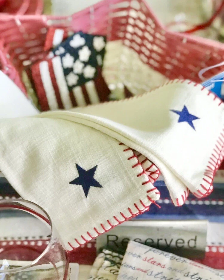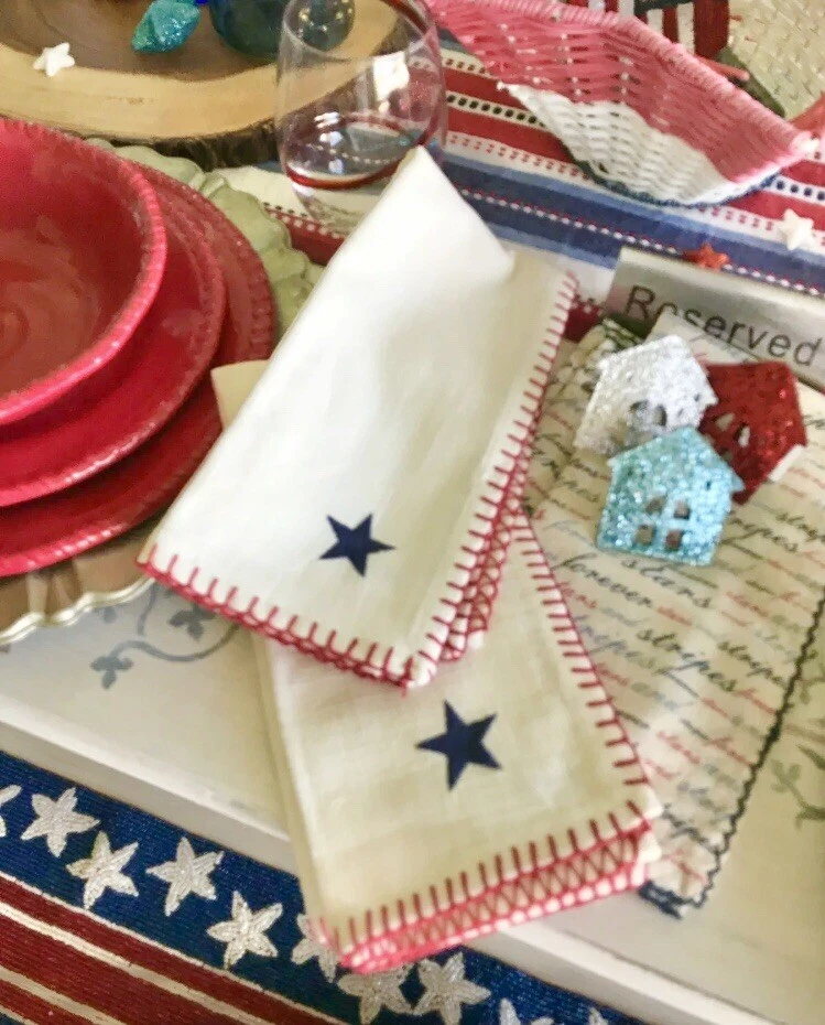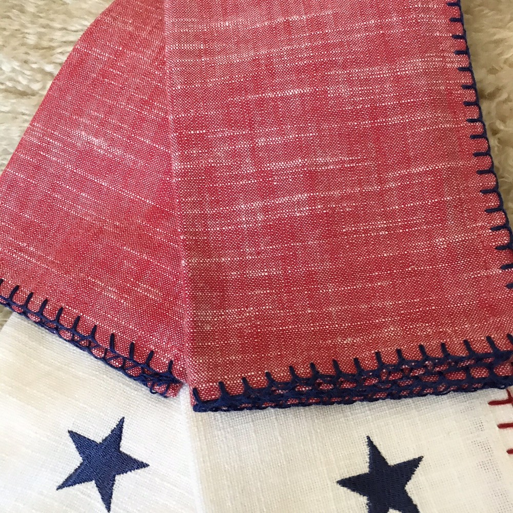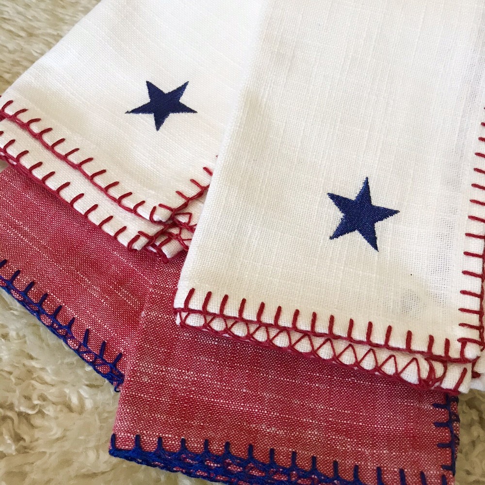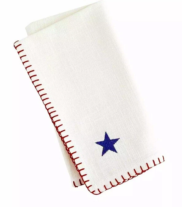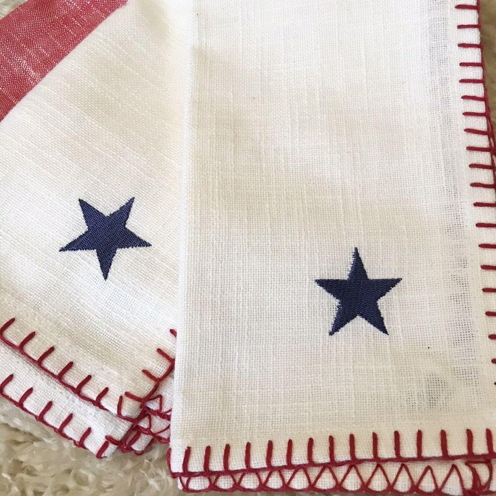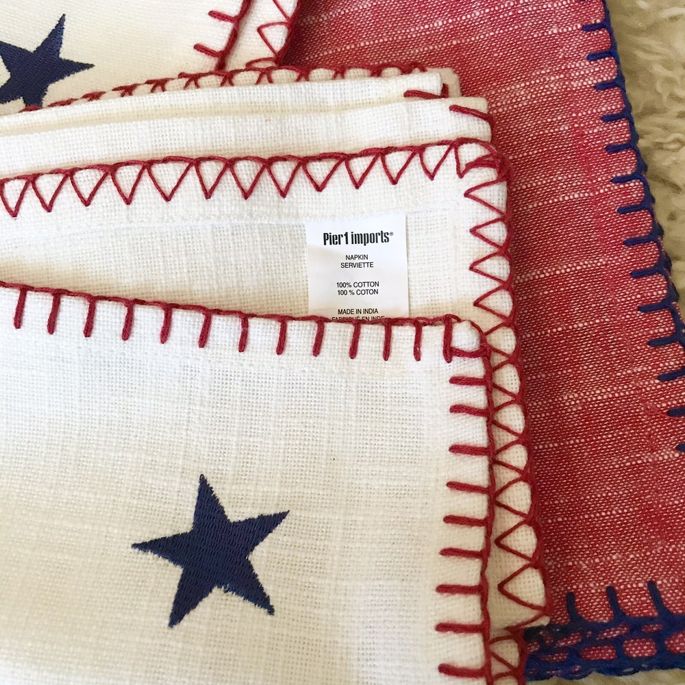 BRAND NWT PIER 1 IMPORTS SET OF 4 PC PATRIOTIC 4 OF JULY STARS AMERICANA STITCHING EMBROIDERED STAR CLOTH NAPKINS 2 PC - RED COLOR ( NO STAR ) 2 PC - WHITE COLOR WITH BLUE EMBROIDERED STARS SORRY, NO EXCHANGE, RETURN OR INTERNATIONAL SHIPPING... PLEASE, CHECK MY OTHER ITEMS FOR SALE! HAPPY BIDDING!!!