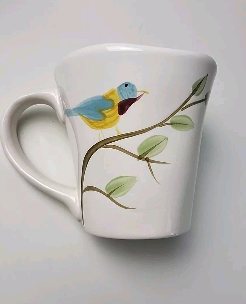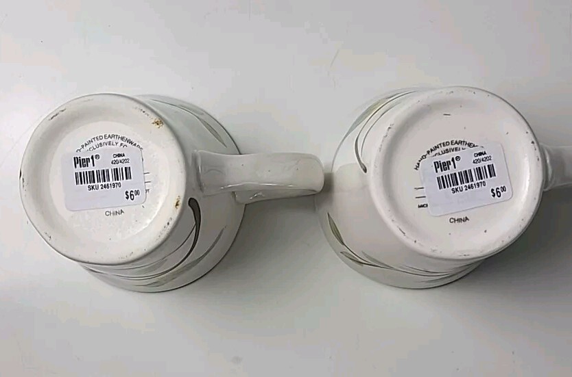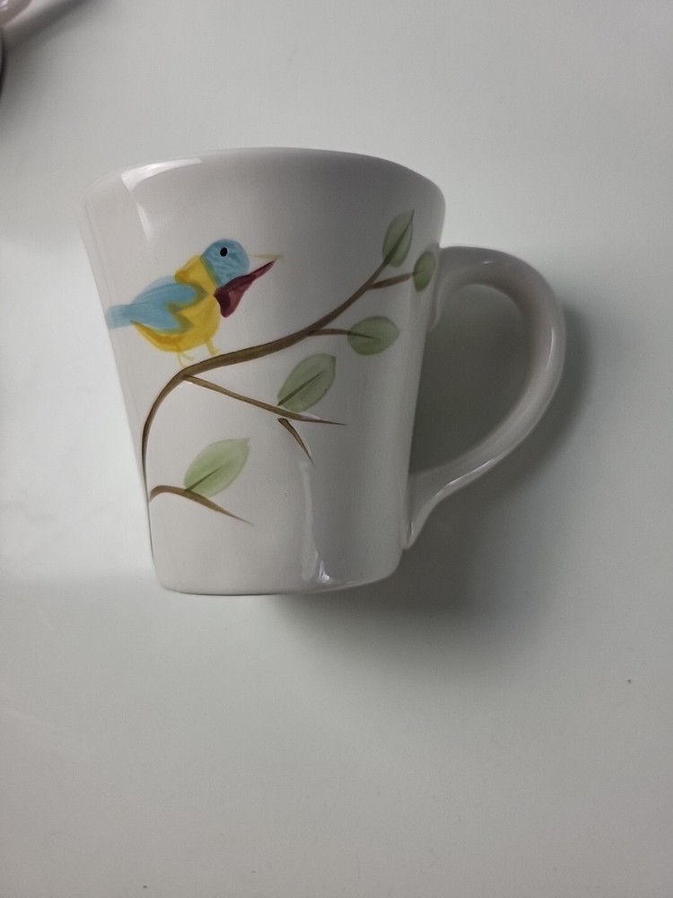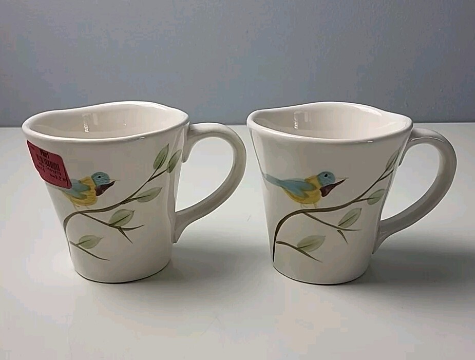 Add a touch of farmhouse charm to your mornings with this set of two Pier 1 Imports coffee mugs. The 16-ounce cups feature a charming robin bird pattern, hand-painted with a glossy finish on earthenware production style. The round shape and off-white color make them suitable for all occasions, perfect for unisex adult use. The mugs come with a handle and are machine washable for easy care. The original studio-crafted production technique ensures that each mug is unique, with a printed backstamp and no signs of wear or use. Ideal for bird lovers, these mugs are a great addition to any collection.