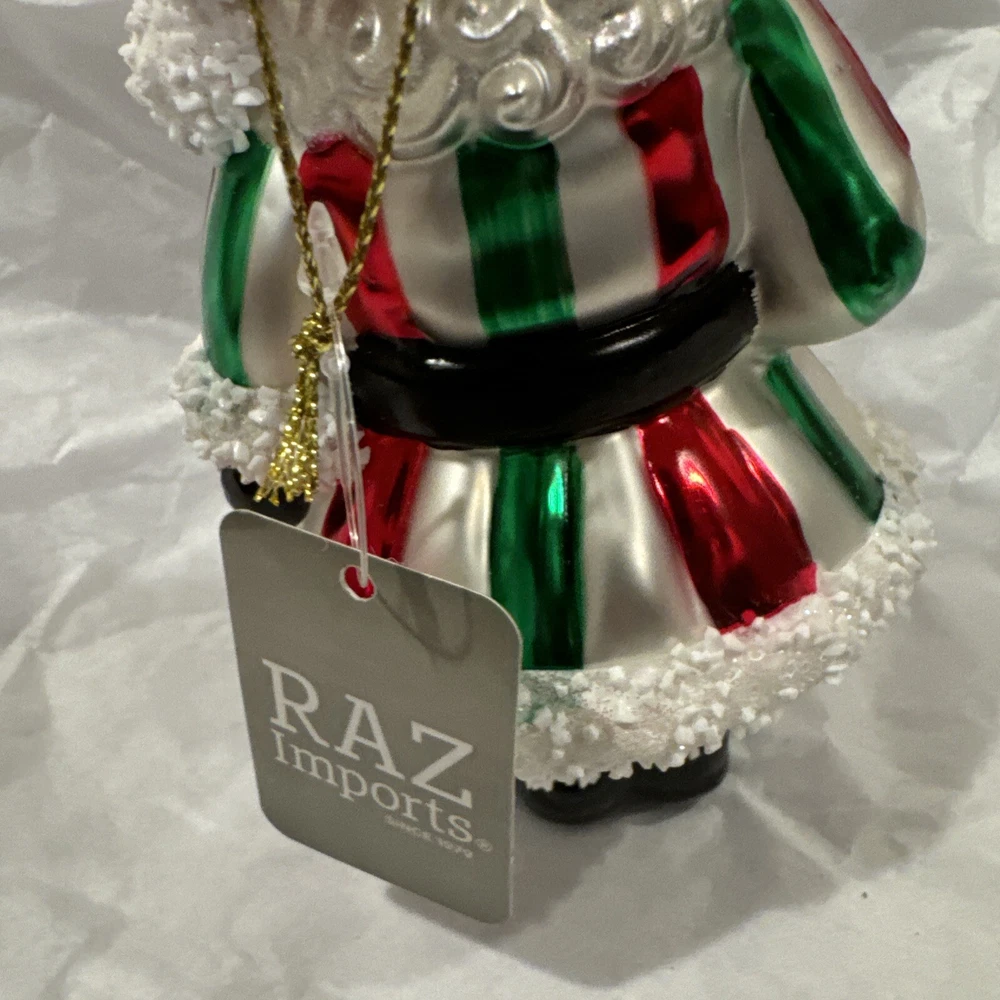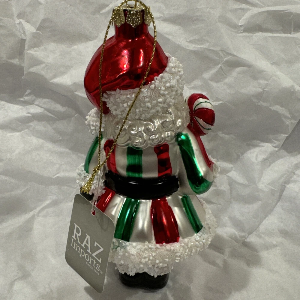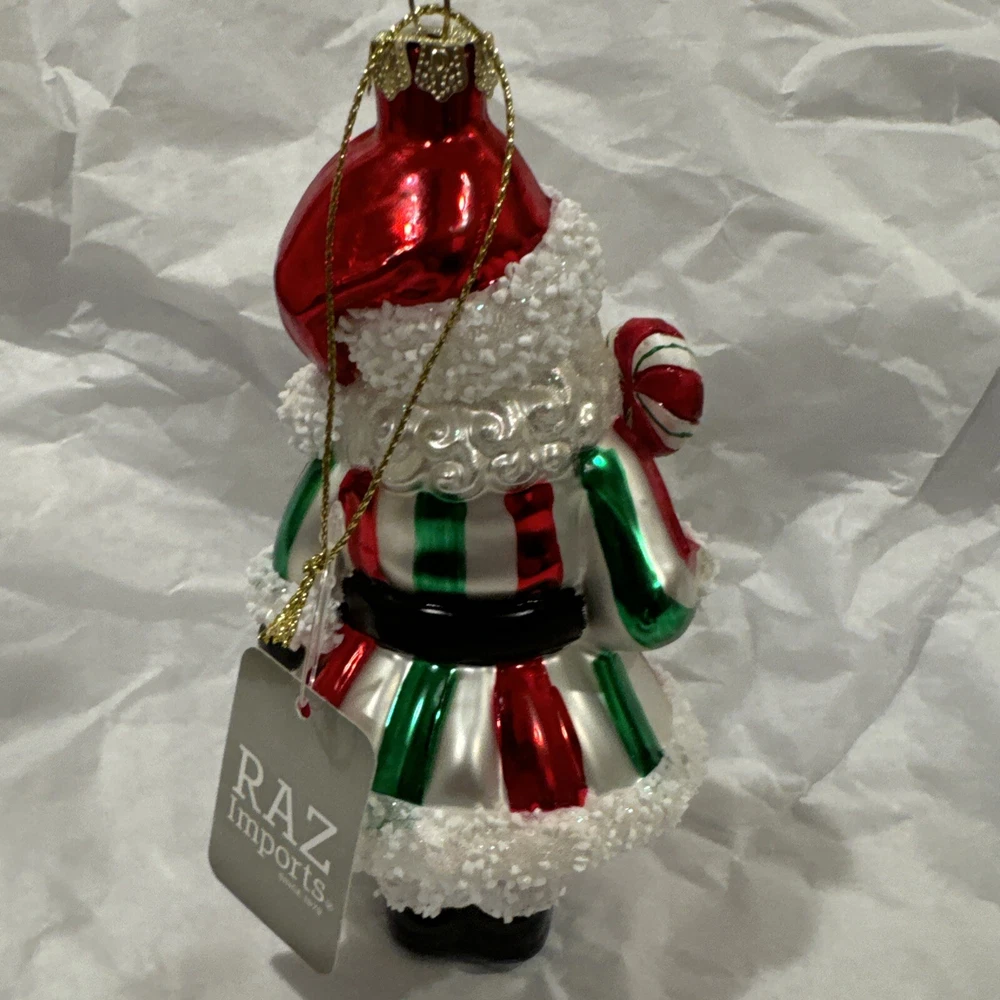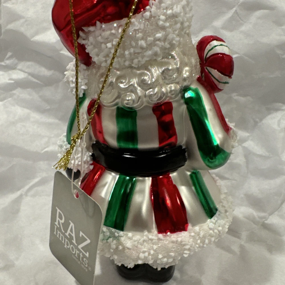 This NEW with tag Raz Imports glitzy with a classy presence Santa Claus Christmas glass ornament features a unique Art Deco style Santa Claus design embellished with glitter and detail throughout , holding a peppermint lolipop. The ornament is medium-sized, measuring 4 inches in length and 6 inches in height. This is a very beautiful ornament and makes a nice addition to any collection or can be used as an incredible gift. Perfect for any adult , Raz Imports never disappoints! Thanks for looking, please check out our other great mixture of listings. We ship out daily and sell quality merchandise for reasonable prices :)