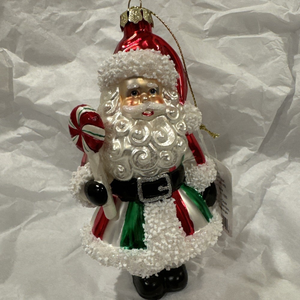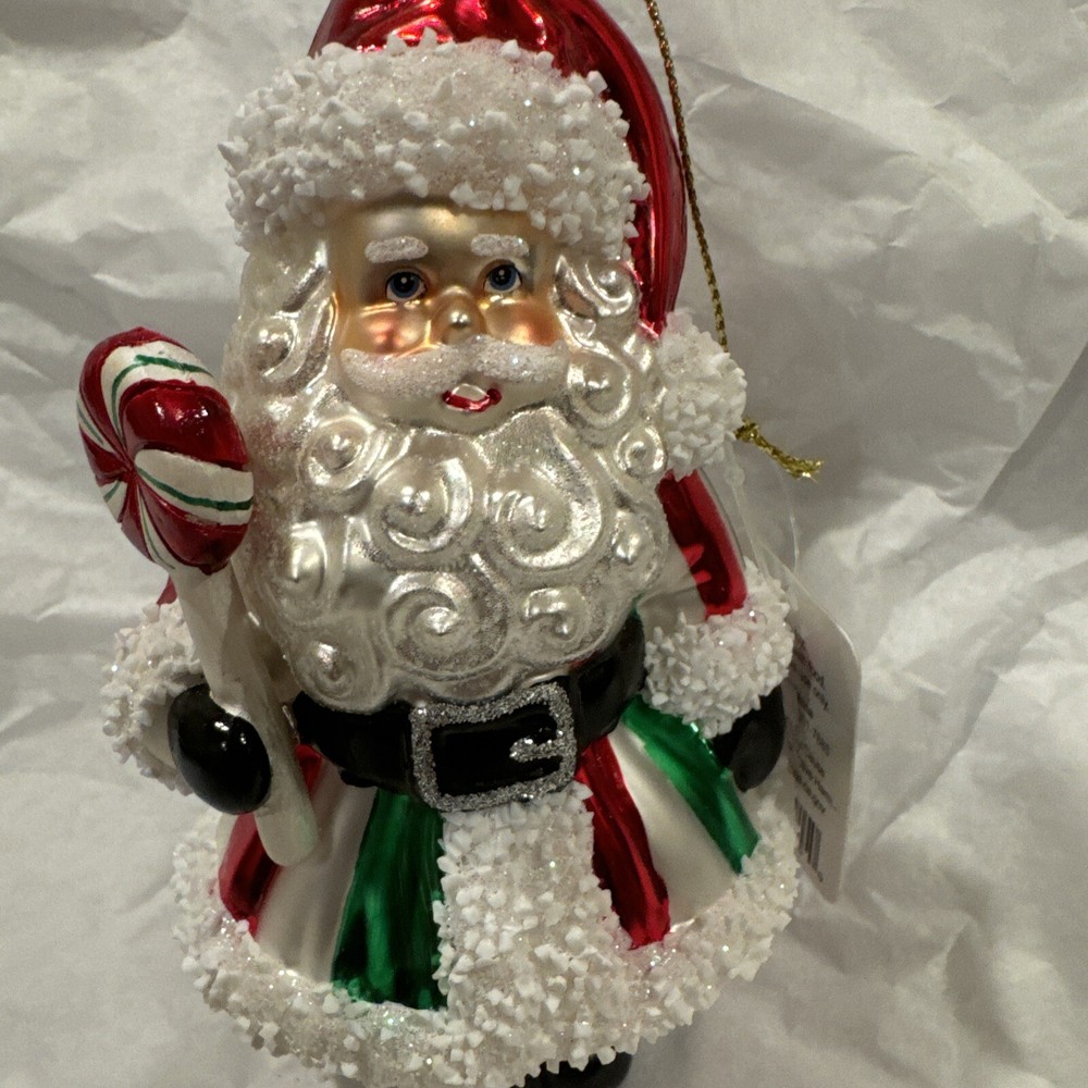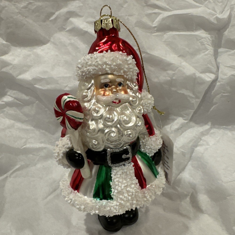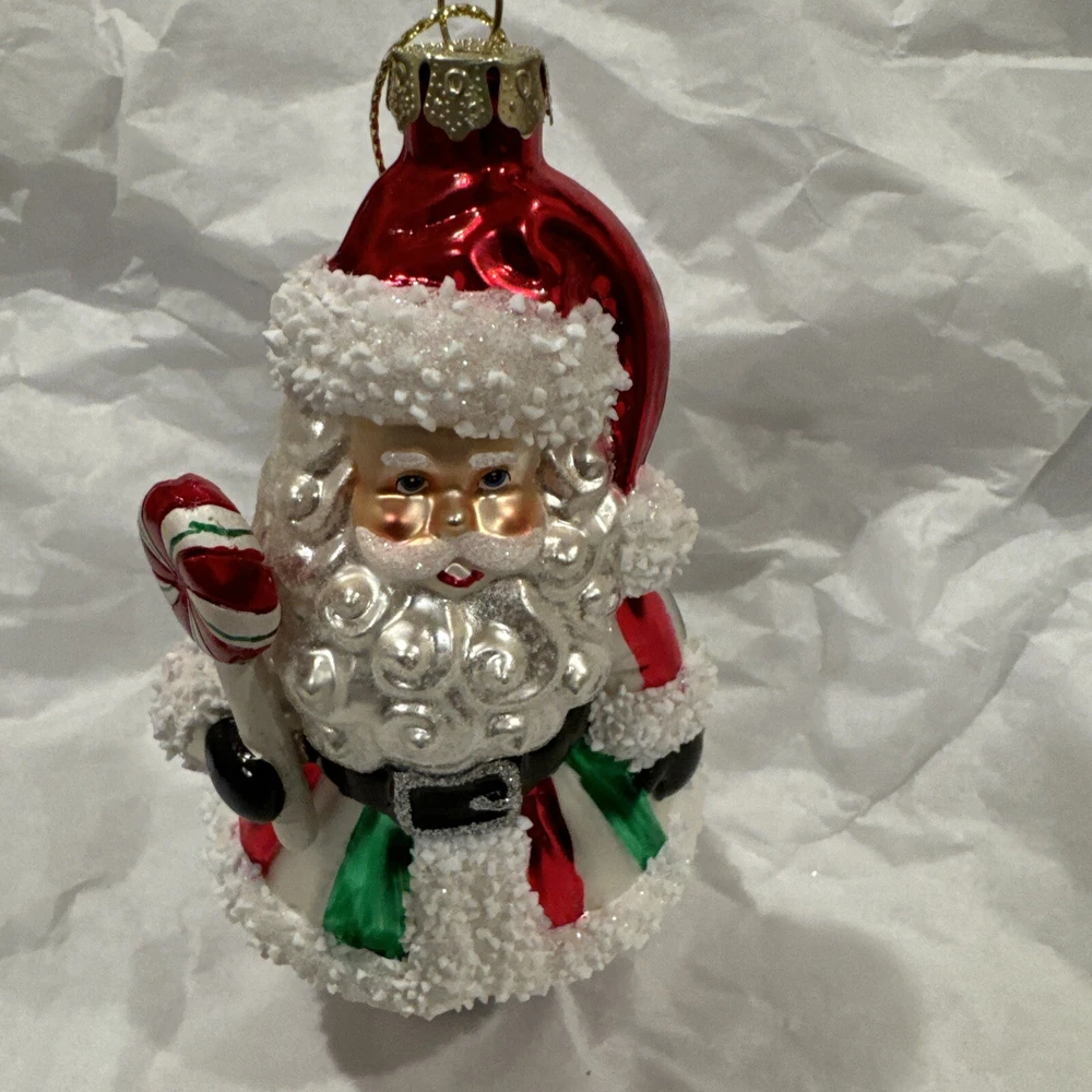 This NEW with tag Raz Imports glitzy with a classy presence Santa Claus Christmas glass ornament features a unique Art Deco style Santa Claus design embellished with glitter and detail throughout , holding a peppermint lolipop. The ornament is medium-sized, measuring 4 inches in length and 6 inches in height. This is a very beautiful ornament and makes a nice addition to any collection or can be used as an incredible gift. Perfect for any adult , Raz Imports never disappoints! Thanks for looking, please check out our other great mixture of listings. We ship out daily and sell quality merchandise for reasonable prices :)
