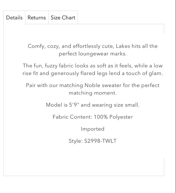 Very soft and cozy loving pants. Fabric is very similar to barefoot dreams Rise - 10” Waist - 28” Inseam - 33” Lakes pant MSRP $79
