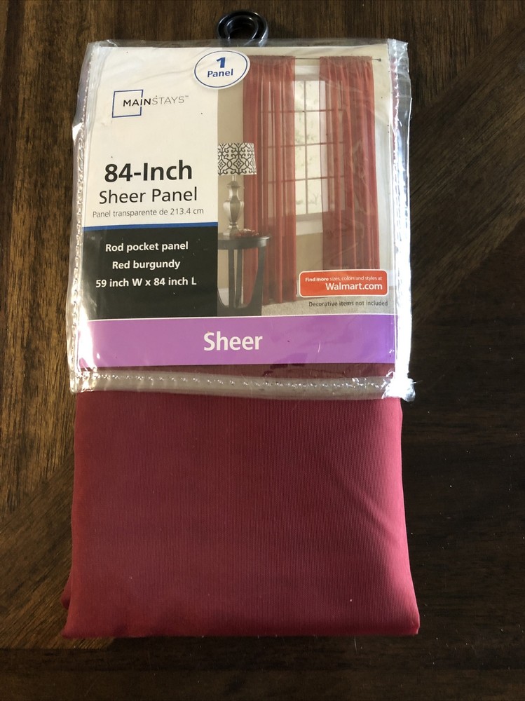 NWT Mainstays Sheer 84-Inch Long x 59-Inch Wide Rod Pocket Window Curtain Panel (1) Red Burgundy. 100% Polyester. Machine Washable. Condition is "NWT". Shipped with USPS Priority Mail....