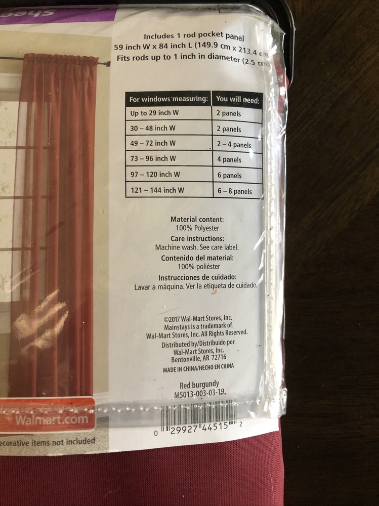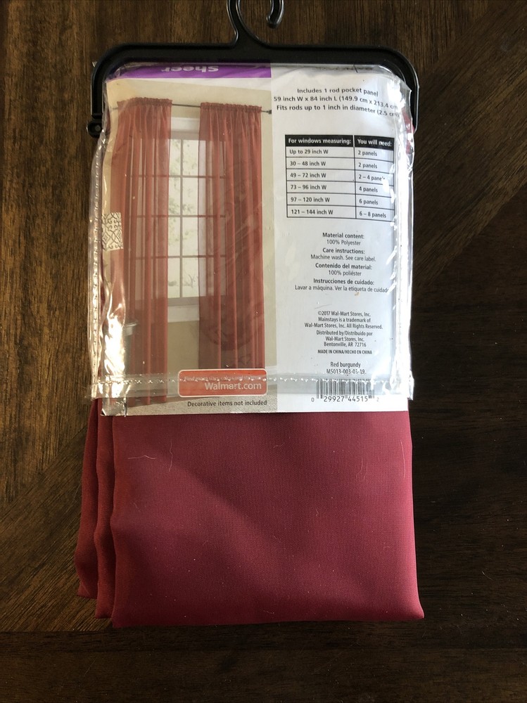 NWT Mainstays Sheer 84-Inch Long x 59-Inch Wide Rod Pocket Window Curtain Panel (1) Red Burgundy. 100% Polyester. Machine Washable. Condition is "NWT". Shipped with USPS Priority Mail.