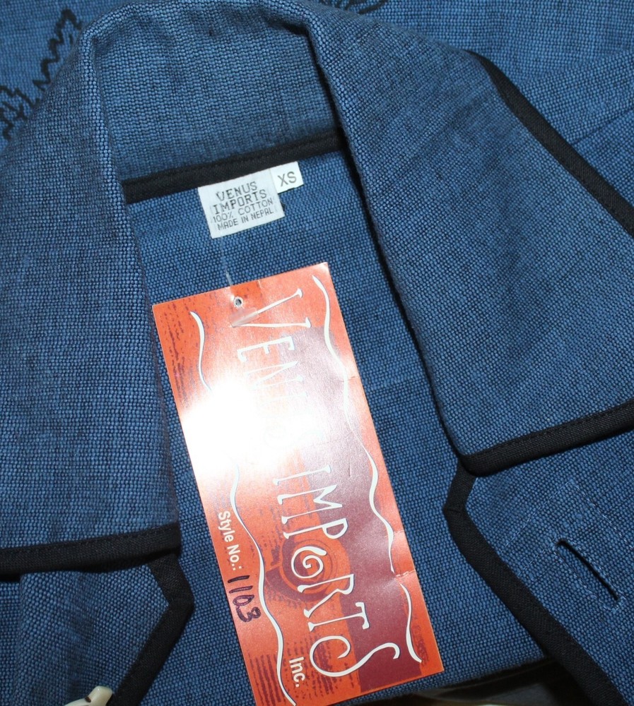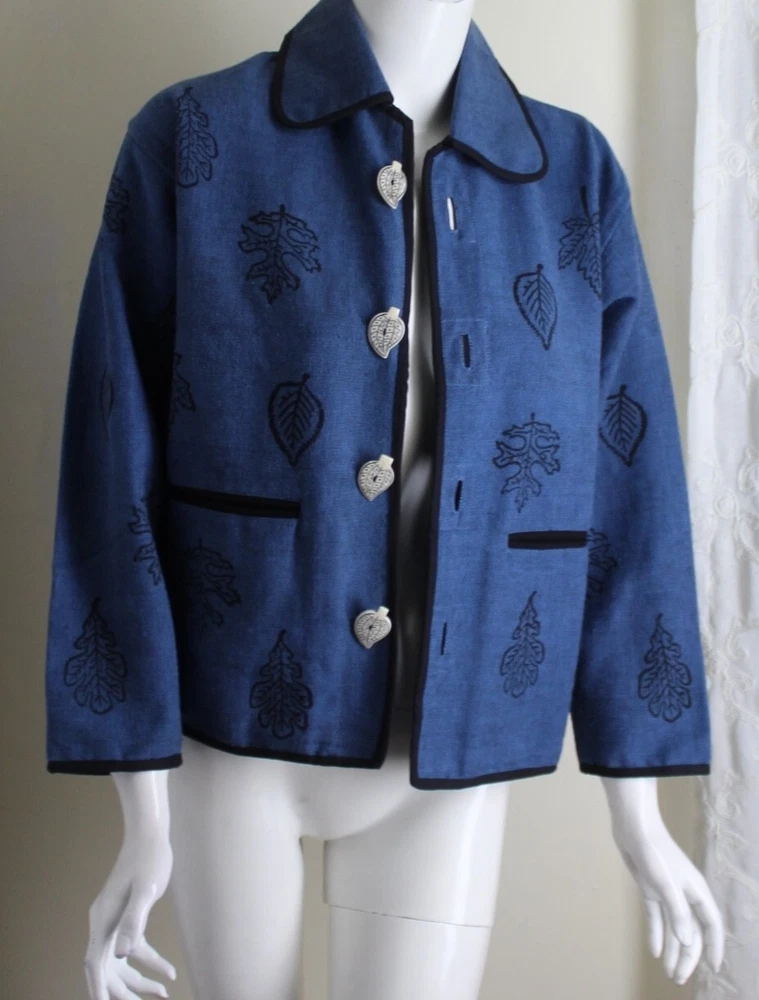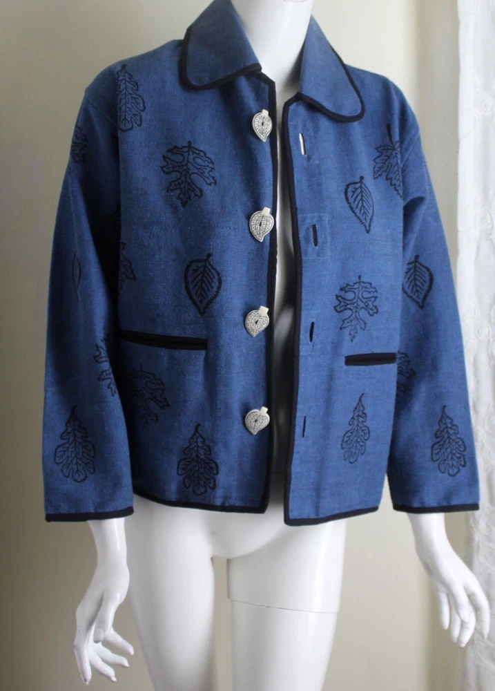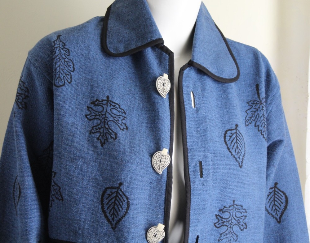 From a very fine clothing collection...please see my other items for more interesting items....click 'save' this seller to follow our store.... Funky super cool jacket from Venus Imports....a boutique brand..this is an exceptional handwoven cotton Nepalese jacket with a classic collar, long sleeves, two front pockets...a fabulous leaf depiction with great buttons...in in the beautiful cotton and printing.... Really special. note, size XS but runs generous. Made in Nepal... 100% Cotton, Dry clean New with tags. MEASUREMENTS: 41 inch bust, 17.5 inches across top shoulder, 20 inch sleeve length, 23 inch length, 42 inches around bottom hem Inventory code:MY1-25-BIN321 Thank you for viewing. A giant thank you to our wonderful customers in the U.S. and Internationally....we've had over 15 wonderful years on eBay! Check out my store for more fabulous hand-woven and art-to-wear garments! Please let me know if you have any questions. I offer combined shipping , please message me for more information and check out my other items. I also offer discounts to returning customers, message me if you've stopped back. International customers: eBAY GLOBAL SHIPPING.