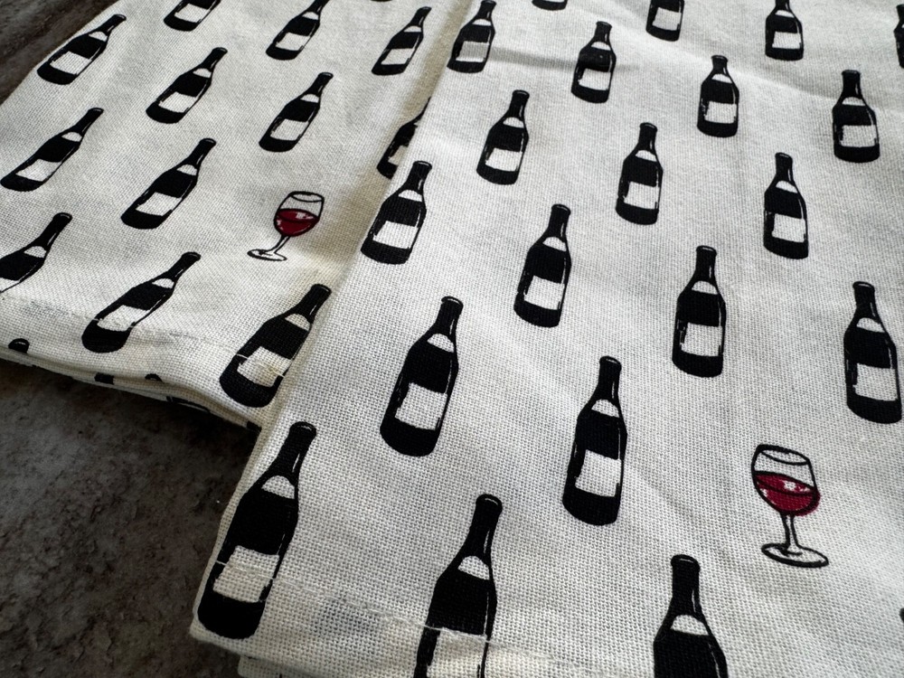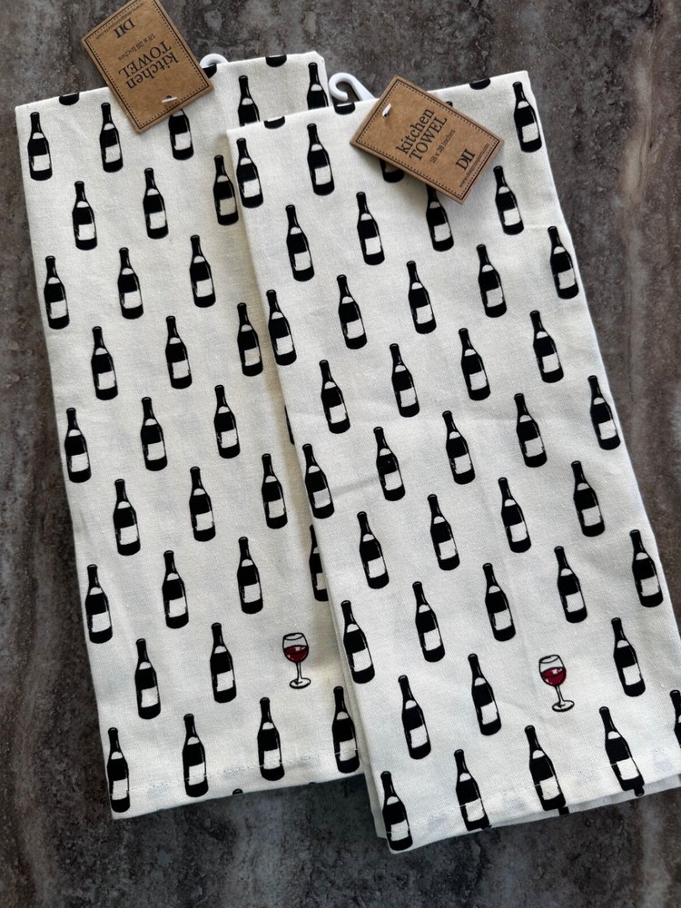 New With Tags Set of 2 Wine Bottle with red Wine Glass Detail Tea Towels/Kitchen Towels 18x28” Design Imports Brand Model #91115 Pattern: Bottle Dots Printed DT Made In India #738215911155