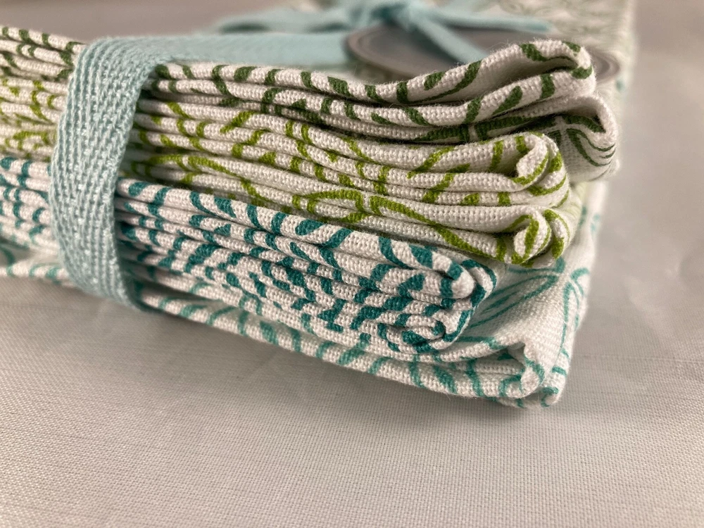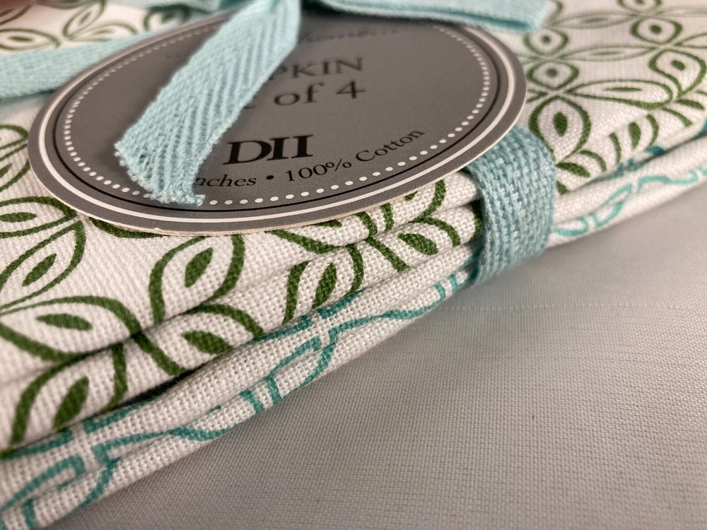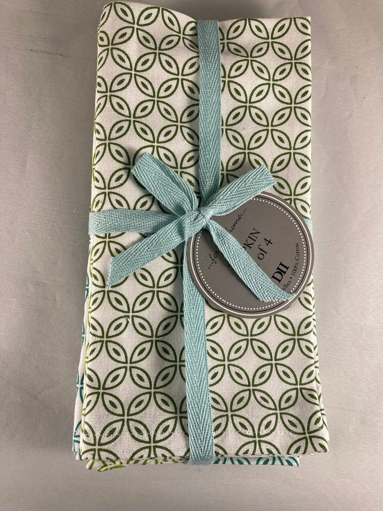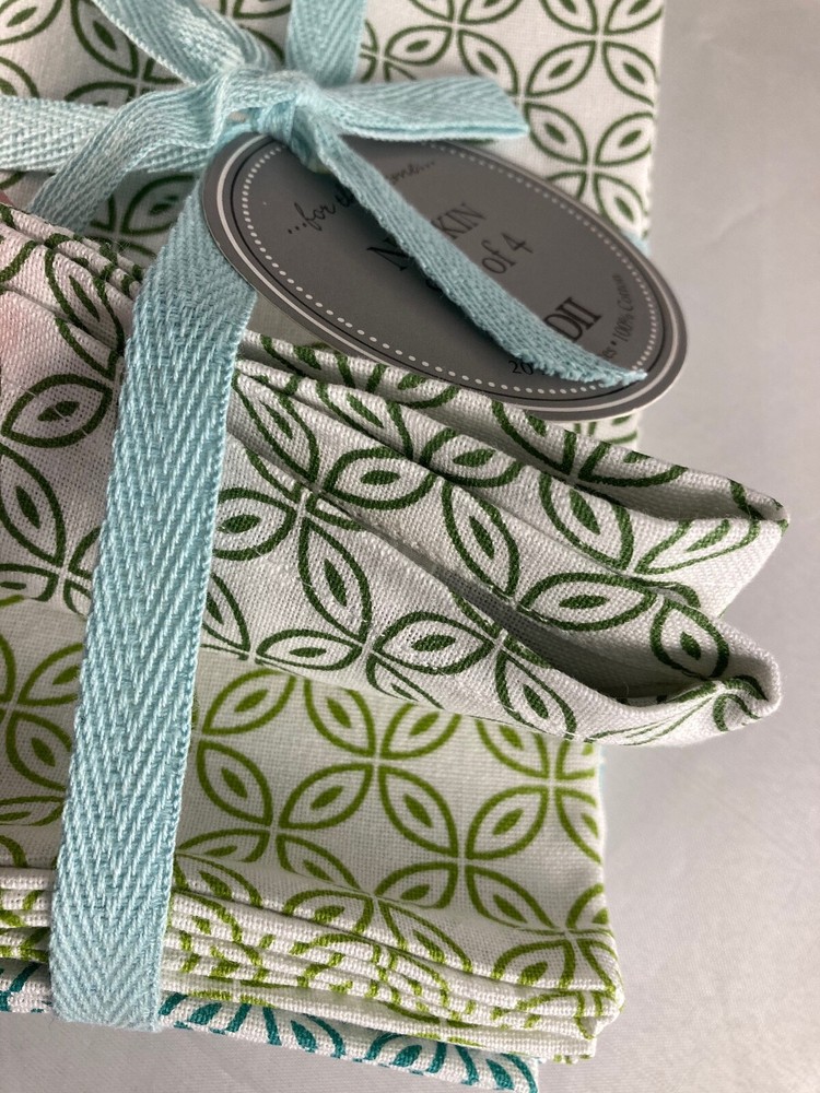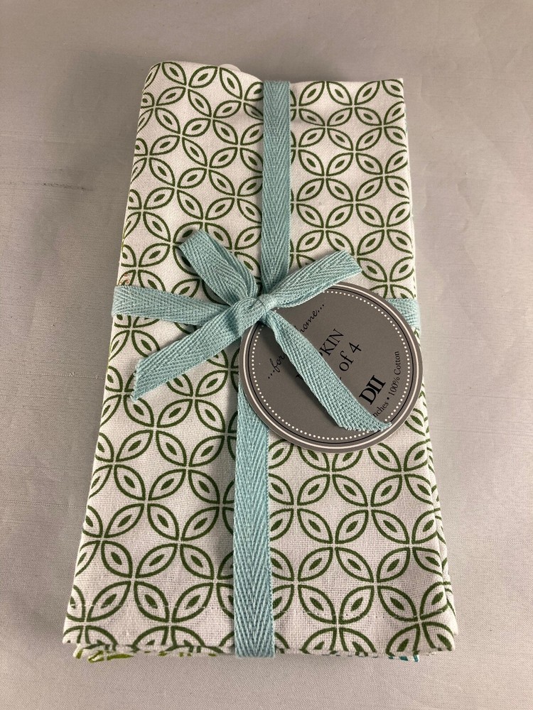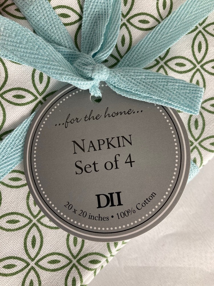 New Set of 4 table napkins by Design Imports 100% Cotton Beautiful Garden Circle Vine Print with four different green colored details Napkins measure 20" x 20" Machine wash, tumble dry See photos for details, message any questions We sell a variety of antiques, collectibles and newer items. Combined shipping discounts are always welcome as long as it does not compromise the items being shipped together. If an item is too fragile or too large, it may have to ship separately. Questions are always welcome and thank you for taking a moment to view our items! We are not experts on antiques and try to describe each item to the best of our ability using completed listings on eBay and internet searches. Please contact us if we misrepresent an item and we will fix the problem immediately. Combined shipping discounts are available on items won or purchased around the same time. Please contact us if you need an exact quote, or your items are completed at different times. We have a quick ship rating with Ebay, so most items ship within ONE day! Please review all our photos and contact us if you have any questions. Sorry there are no refunds.