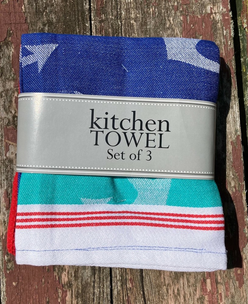 A set of 3 nautical kitchen towels featuring 2 anchor themed kitchen towels; 1 striped, 1 white with blue anchors, and 1 solid red towel. Can be used as decorative theme towels, dish drying towels, or hand towels. Each towel measures 18 x 28 inches, made of 100% cotton, machine washable.