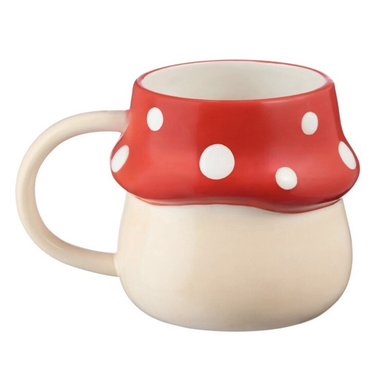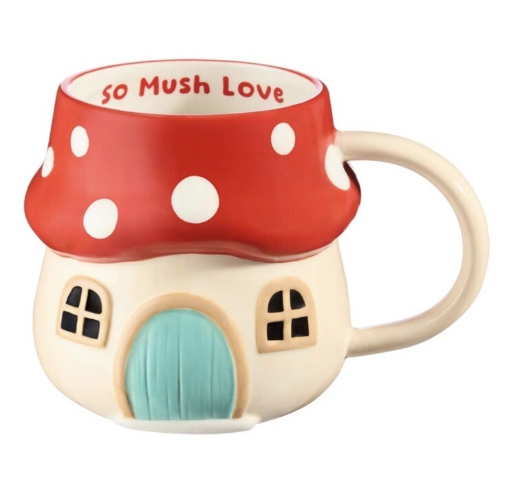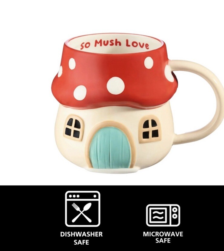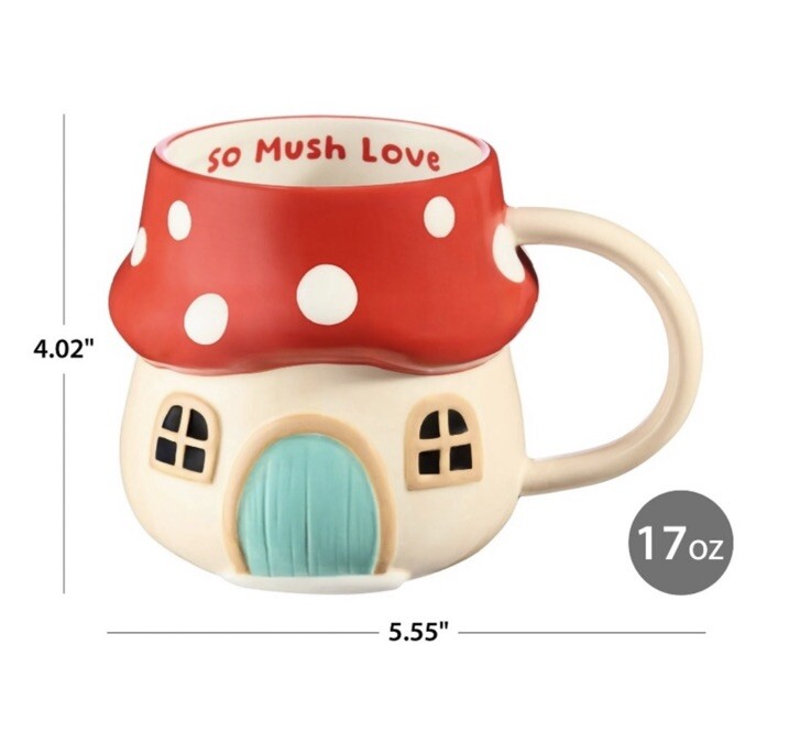 Brand new 17 oz Red & Beige Mushroom Earthenware Mug Adorable mug is shaped like a mushroom cottage Inside rim of the mug carries a playful message: "So mush love" Whimsical addition to your drinkware Dishwasher and microwave safe May become hot in microwave