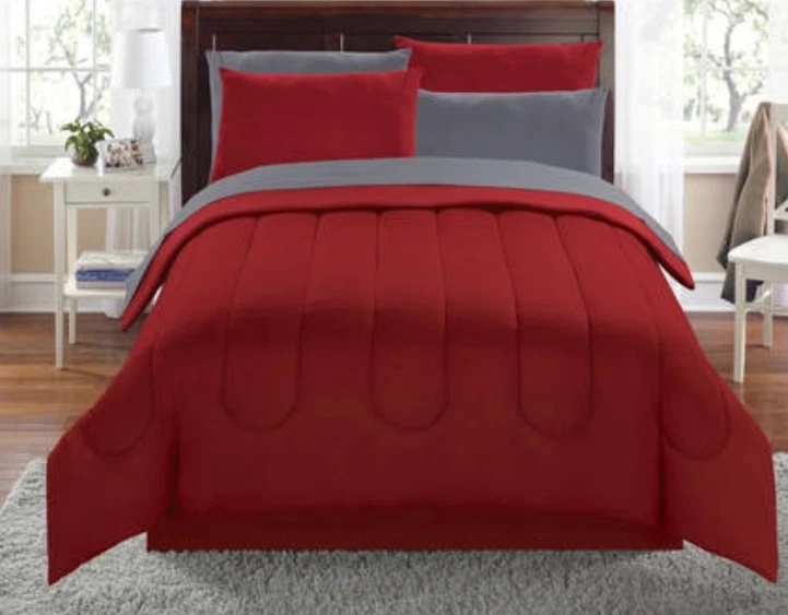 Free Shipping!!! Also comes with a bedskirt!!!! Give your space a solid grounded look with Mainstays Solid Bed in a Bag. Available in Red, Navy and Gray, this bedding set gives you options to update your room in dark or bright colorways. The Red bedding set features a dark gray neutral sheet set that help tone down the look of the deep red comforter for a perfectly contrasted look. The Navy bedding set features a light blue solid sheet set that offers a hint of light colors to your dark bedding set. Complete the look of your Mainstays Solid Bed in a Bag with the bed skirt that perfectly matches or red or navy toned comforter. Each Mainstays Solid Bed in a Bag includes a comforter, sheet set, pillow case(s), sham(s) and a bed skirt. Available in twin, full, queen and king sizes so you have plenty of options to make this bedding set work in you home. Made with 100% polyester microfiber for softness and comfort that will have you sleeping soundly all-night long. Mainstays Solid Bed in a Bag is easily integrated into your already decorated space. Update your bedroom today with a solid grounded look with Mainstays Solid Bed in a Bag. Machine washableTwin size includes: 1 twin comforter (64" x 86"), 1 fitted sheet (39" x 75" + 14"), 1 flat sheet (65" x 94"), 1 standard pillowcase (20" x 30"), 1 standard pillow sham (20" x 26") and 1 bedskirt (39" x 75" + 14") Full size includes: 1 full comforter (76" x 86"), 1 fitted sheet (54" x 75" + 14"), 1 flat sheet (80" x 94"), 2 standard pillowcases (20" x 30"), 2 standard pillow shams (20" x 26") and 1 bedskirt (54" x 75" + 14") Queen size includes: 1 queen comforter (86" x 86"), 1 fitted sheet (60" x 80" + 14"), 1 flat sheet (86" x 100"), 2 standard pillowcases (20" x 30"), 2 standard pillow shams (20" x 26") and 1 bedskirt (60" x 80" + 14") King size includes: 1 king comforter (102" x 86"), 1 fitted sheet (78" x 80" + 14"), 1 flat sheet (104" x 100"), 2 king pillowcases (20" x 40"), 2 king pillow shams (20" x 36") and 1 bedskirt (78" x 80" + 14") We ship only to lower 48 states. We can not ship to Hawaii, Alaska, PO Boxes, or Military addresses. I care about your complete satisfaction. If you have any questions about the items for sale, or have a problem that needs resolved, please email me so we can find a solution. If you enjoy your purchase and our customer service, positive feedback is greatly appreciated. If for any reason you are planning to give me a neutral, negative or a lower rating feedback please contact me first and give me a chance to regain your trust. We are using several different major retailers. The item will be shipped directly from our supplier. In the unlikely event that the item is sold out or on back-order, we will refund 100% of your money immediately. In the event that a product arrives damaged we require a return for a refund or we will provide a return replacement. We do not give a partial refund as retail stores also require a return and do not negotiate partial refunds. Additionally we do not negotiate prices after the item has been purchased. Please be advised we report all feedback solicitations to eBay for investigation. If for any reason you do not want the product or are disappointed for any reason we do not negotiate partial refunds but require a return for a refund or return replacement. Purchasing the item is agreeing to our terms.