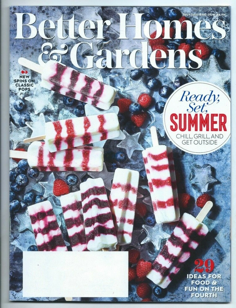 New "Better Homes & Gardens Magazine July, 2021" Ready Set Summer Chill & Grill This Great Listing is for the Brand New Better Homes and Gardens Magazine with no label. This Magazine is the July 2021 Issue and features the Ready Set Summer Issue with Chill, Grill and Get Outside, New Spins on Classic Pops, 29 Food Ideas, Fun On the 4th and much more.