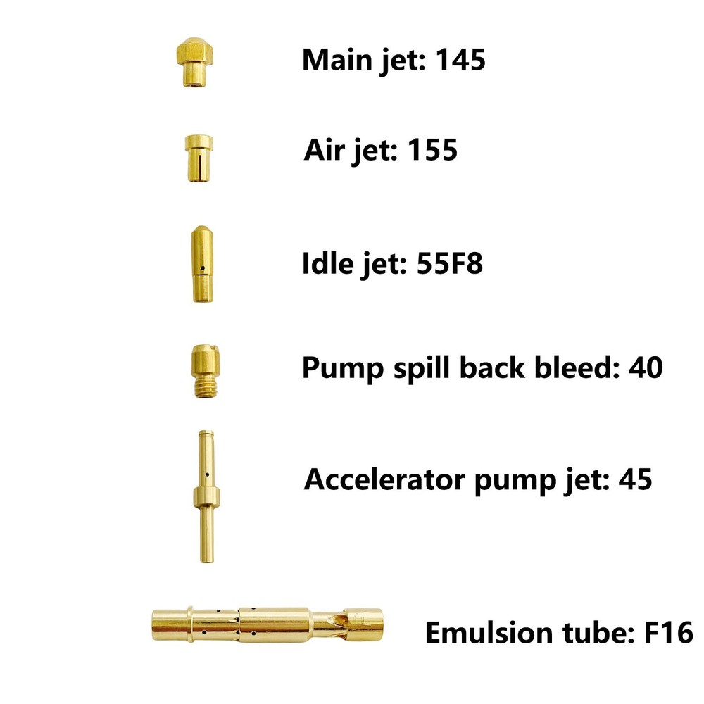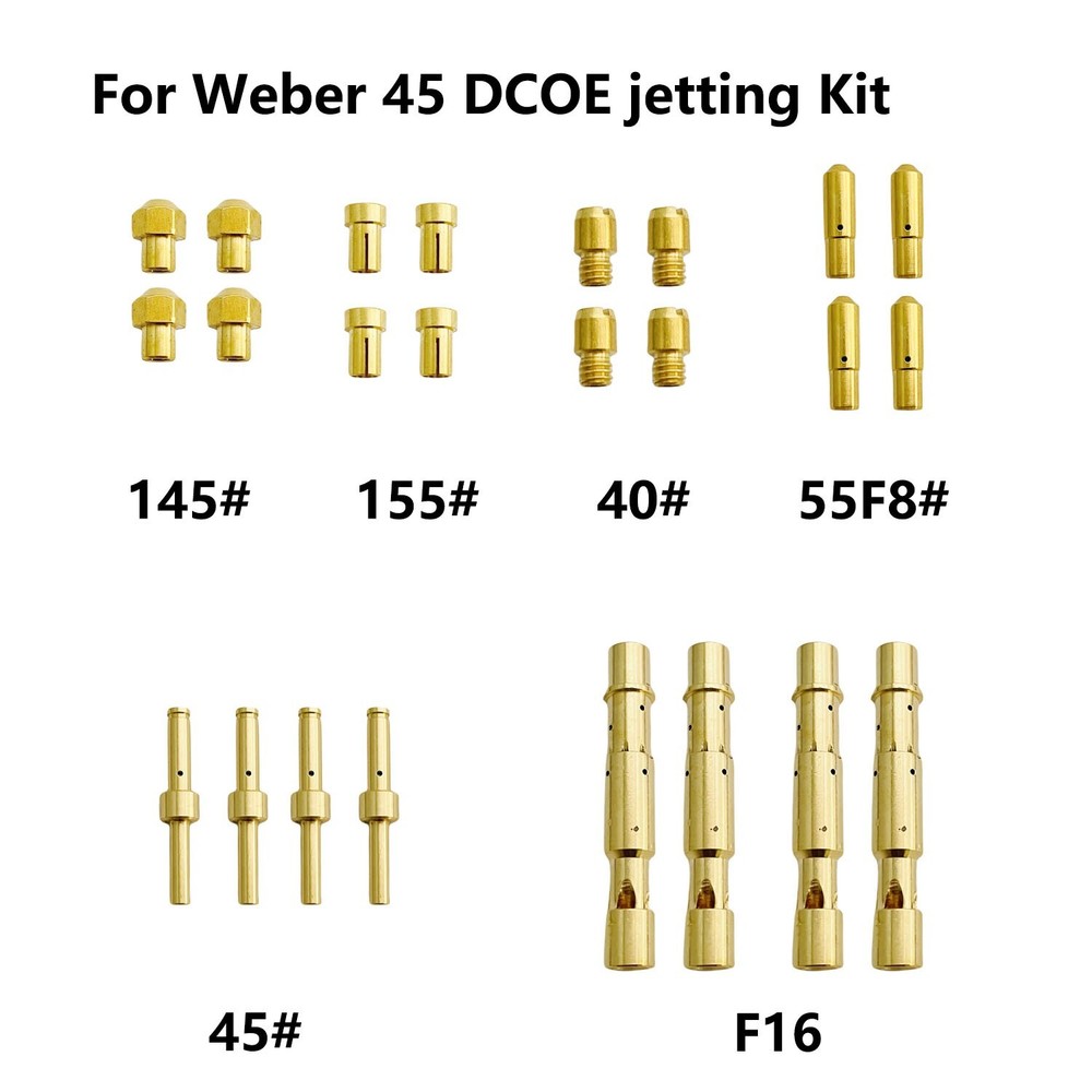 EBAY SHOP FEEDBACK PROFILE CONTACT US We are offering for sale New Carburetor Complete Set jetting Kit fits for Weber 40 DCOE carburetor 24 Pcs 4x Main jet: 145 4x Air jet: 155 4x Idle jet: 55F8 4x Emulsion tube: F16 4x Accelerator pump jet: 45 4x Pump spill back bleed: 40 or custom setting Dont like our set? Pick the sizes you like! Just write us what size you need. plus 1x Jet box FREE Would you like set for 2 carbs? Just purchase 2 sets and we package it into 1 box. Other variants of this item: 40 - find it here: https://www.ebay.com/itm/235220283966 45 - find it here: https://www.ebay.com/itm/235220281542 WHAT YOU SEE IS WHAT YOU GET We offer WORLDWIDE shipping. You will always receive tracking number. All products we sell are free of shipping. Not sure about item or need more parts, but can't find it? Contact us! If you are buying item which needs to specify model,size,type etc...: make sure you send us this information make sure you receive email or message with request confirmation! Notes to seller are not saved in sales record sometimes! You will receive just what is stated in the "ready to be packed" email. If your request is not stated there, contact us asap. Store Categories Carburetors Jets, tubes, valves Main jets Air correctors Idle jets Pump jets Emulsion tubes Jetting kits Emulsion Tube Holder IDLE JET HOLDER Air bleeds sarew Mass Air Flow Meter Non-Return One Way Check Valve Swivel Hose End Fittings Carburetor Repair kit Repair kit Float Accelerator Pump Diaphragm Inline Fuel Filte r 50mm 58mm Fuel Inlets Fuel Pressure Regulator Idle mixing screw Other items Why to buy from us ? High quality parts Cheapest on ebay 60 days for return Every item is guaranteed The most advanced machines It has a history of 24 years Customer service Friendly attitude Quick Service Shipping We do ship worldwide Fast Delivery All parcels are insured Always Tracking number Payment Pay within 7 days