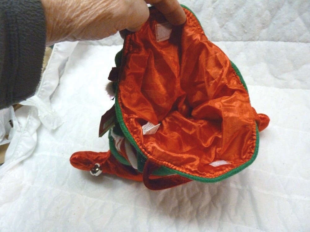 PRICE REDUCTION! This is a new with tag velvet Christmas Jester design velvet gift bag with handles, Velcro closure and a jingle bell on each foot. Laid flat the bag portion is 10" wide and 6" high, plus room inside the padded feet which are 17" across when also laid flat. The original retail price for this was $11.95 and we're selling it for only $1.99! From a smoke and pet free home. We are currently selling on eBay other Christmas decorations and craft supplies on eBay. You can buy from us with confidence as we have been an ebay member since 2001, selling over 5,600 items with a 100% positive feedback rating. We fully inspect all products prior to quick shipping from the US, without any extra service or handling fees. Please see our large assortment of other items we are offering for sale on eBay. We are selling (or will be soon listing) women's purses, sandals, shoes, boots & plus size clothing; men's clothing & ties, books, posters, original artwork & prints, plus a wide variety of antique and vintage: cameras & photo accessories, silver plate items, Limoges & other fine china from around the world, souvenir & collector plates, pottery, pitchers, vases, cranberry glass, tea pots, advertising & country store tins and much more! Please check our listings regularly as our selection changes often. There would be a savings in shipping costs if more than 1 item was purchased and shipped at the same time.