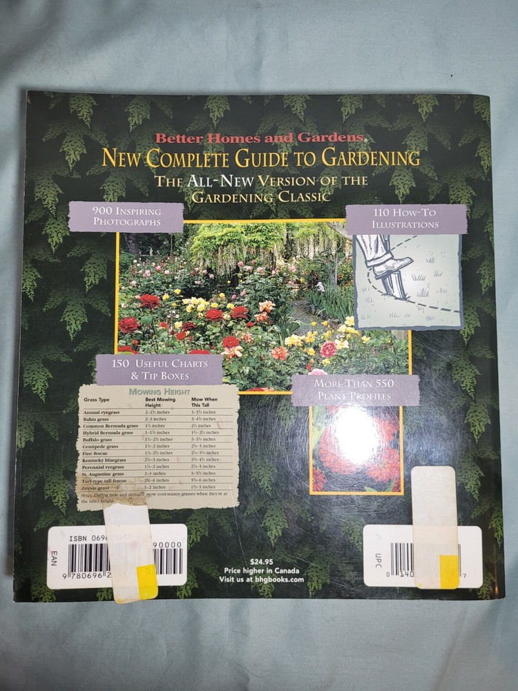 Better Homes and Gardens New Complete Guide to Gardening is a comprehensive guide to all things gardening. With 600 pages filled with information on gardening, gardens, and plants, this book is a must-have for gardening enthusiasts. This book is a useful addition to your library, and at 10 inches tall and 9.5 inches wide, it is also a beautiful coffee table book for displaying. There are stickers on the covers and some slight discoloration inside the covers, but the pages are in excellent condition. Note that the dark color on the edges is the way the book is printed. Shipping is calculated by zip code and you can choose the service you want - ground may be cheaper than media depending on your location.