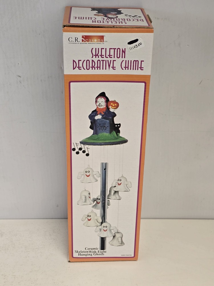 New Halloween Ceramic Wind Chime Skeleton With 8 Hanging Ghosts Vintage 90's NOS...