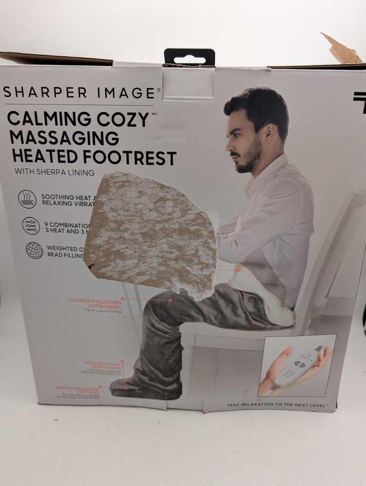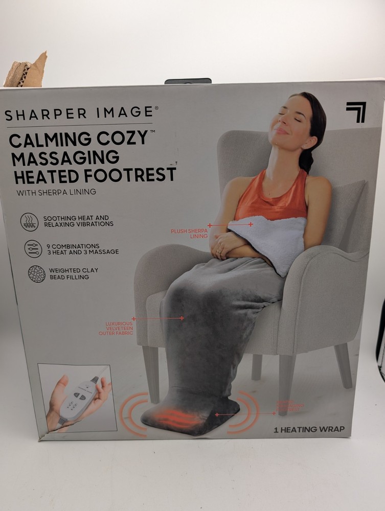 New In Box Sharper Image Calming Cozy Massaging Heated Footrest- Gray. Open box, only opened to test it works. Never used.