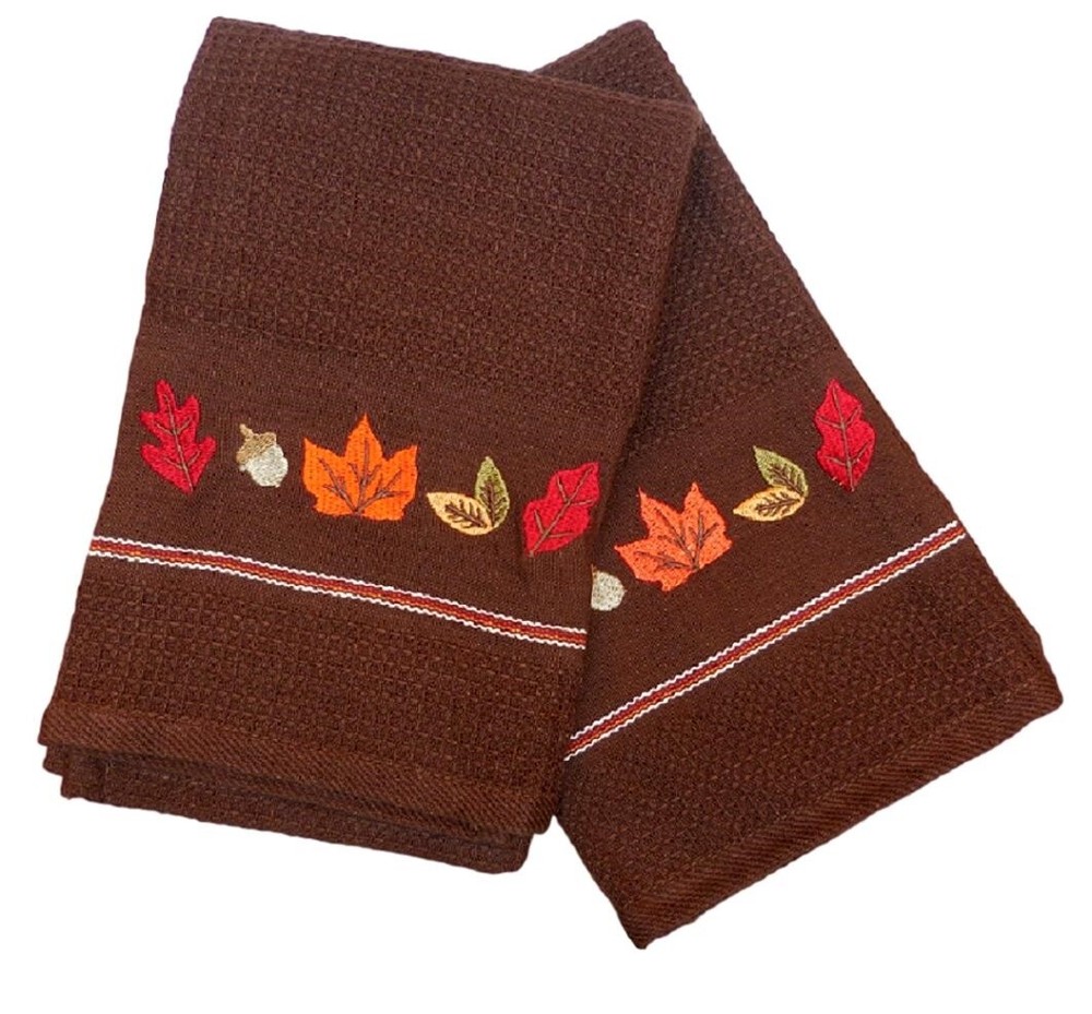 New Lot Set of 2 Fall Autumn Harvest Thanksgiving towels in waffle weave brown. 100% cotton 18X28"