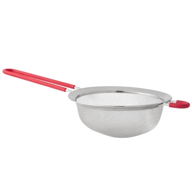 Complete your collection of everyday kitchen gadgets with the Mainstays Fine Mesh Strainer Basket. Designed with home chefs in mind, this handheld strainer with a 6-inch diameter straining basket is perfect for washing fruits and vegetables, rinsing beans and other canned goods, dusting baked goods with powdered sugar, separating seeds, and more. It efficiently catches small morsels while allowing liquids and fine ingredients to filter through. With a lightweight design and secure hook along the wire frame, this strainer offers busy cooks extended hands-free straining with the ability to hang it on the rims of bowls and cookware. The ergonomic nonslip handle offers a firm and comfortable hold. Constructed with durable stainless steel, the strainer is built to last and is top-rack dishwasher safe for a quick and easy clean up after use. Build your kitchen from the ground up with all the cookware, bakeware, tools, dinnerware and other items you need to create a useful cooking and dining arrangement. The Mainstays kitchen collection focuses on colorful and decorative design applied to simple basics, keeping your daily life vibrant and efficient. Ideal for sifting flour, straining sauces, rinsing rice and beans, and much more. Catches small particles, scraps, and seeds while letting liquids drain through. Can also be used for washing small amounts of various fruits, veggies, and herbs. Non-slip red-colored silicone handle provides a firm and comfortable grip. Fine mesh strainer basket has a convenient diameter of 6"
