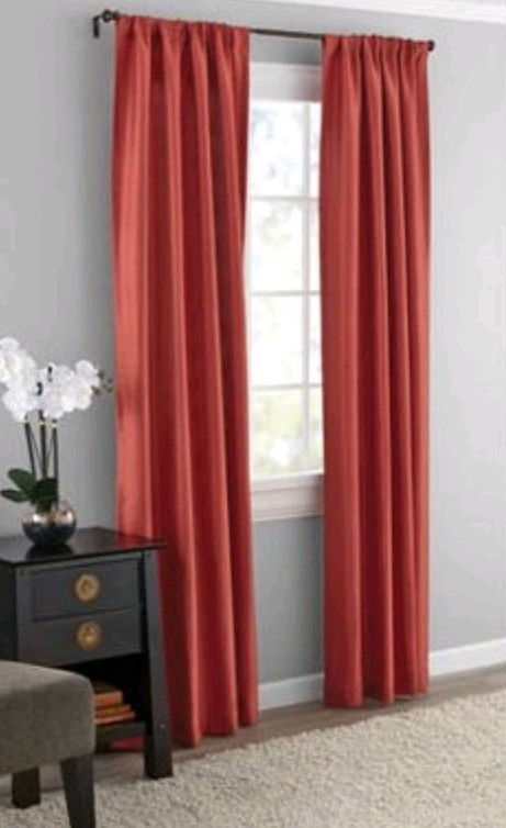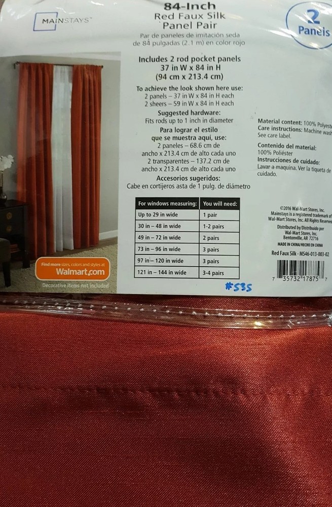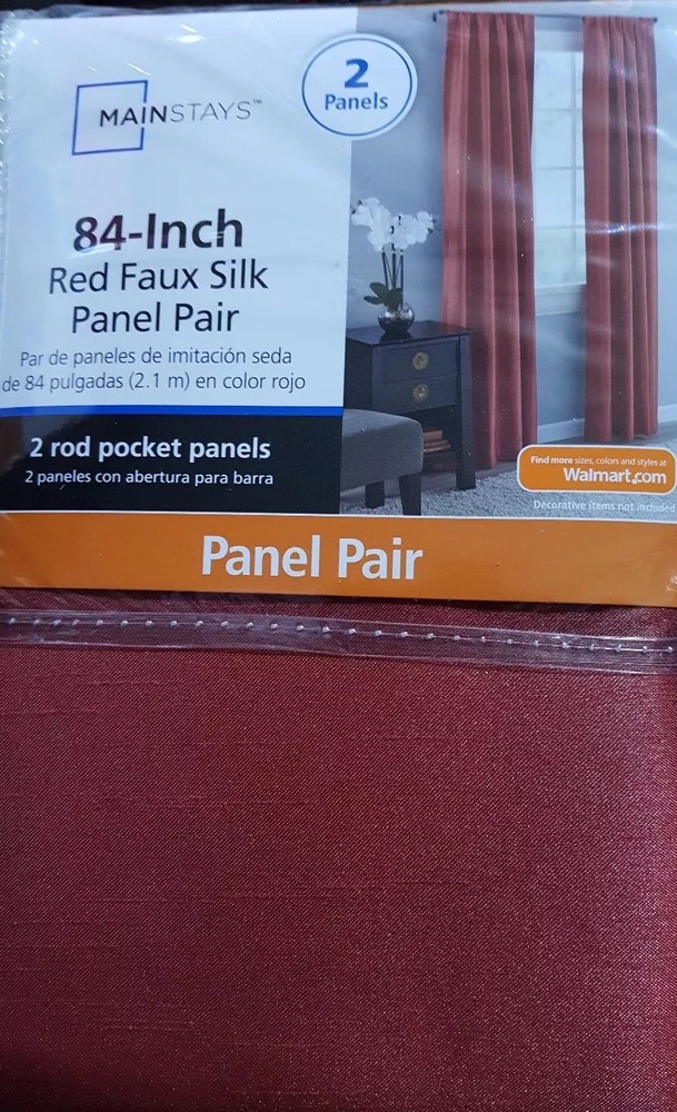 Mainstays red Faux Silk 84" panel pair 2 Rod Pocket Panel, 37"x84" Machine washable 100 percent polyester...