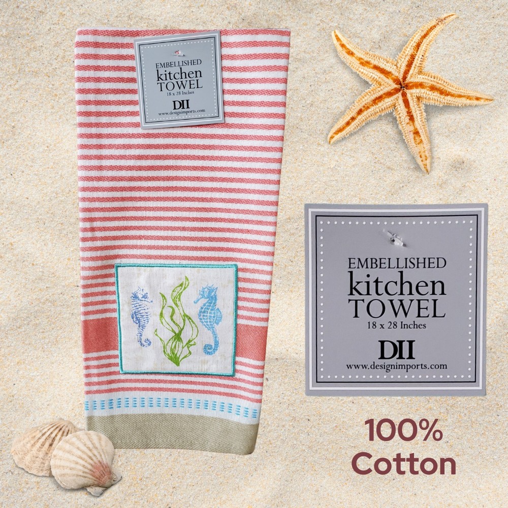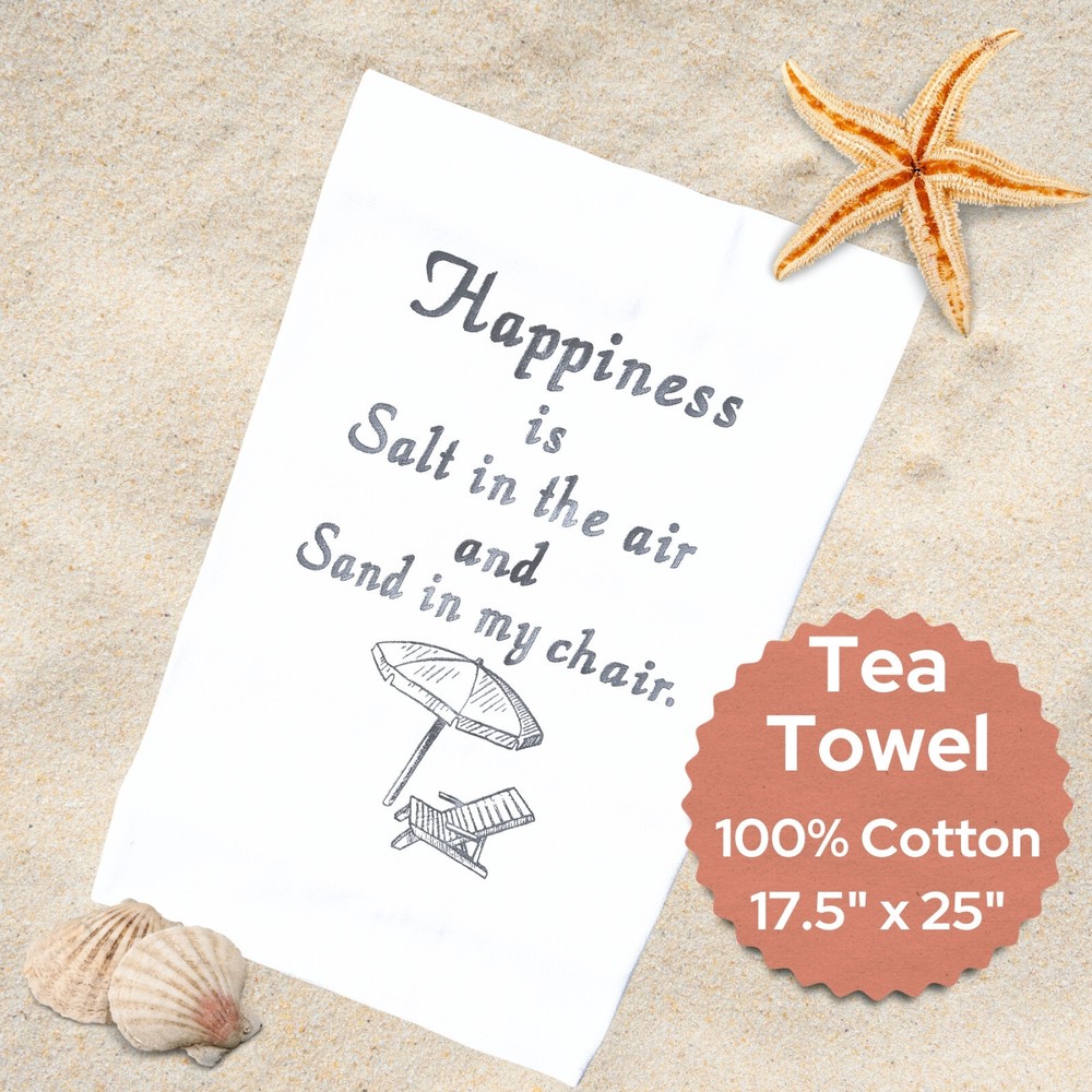 This Ocean-themed kitchen towel set is the perfect addition to any home. The set includes two unique towels that feature a beach theme, making it a great gift for Mother's Day, Christmas, birthdays, or any other special occasion. The towels are made of high-quality 100% cotton and come in a beautiful multi-color and white design. The white tea towel has the phrase, "Happiness is salt in the air and sand in my chair" written in dark gray lettering, with an umbrella and beach chair. The other towel features beach colors (coral, tan, & blue) and an embellished off-white square with two seahorses & seaweed inbetween. The towels are multipurpose, making them suitable for use in the kitchen or they can be proudly displayed on the oven door handle. They are also machine washable, making maintenance a breeze. Get this amazing towel set today and enjoy fast & free shipping! Towels are stored in a Smoke-FREE environment. **Seashells & Starfish Pictured are not included**