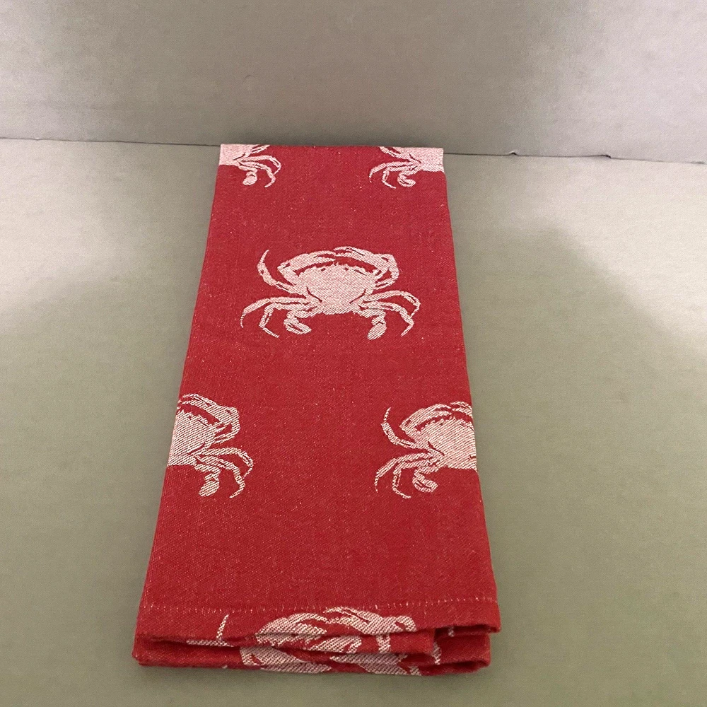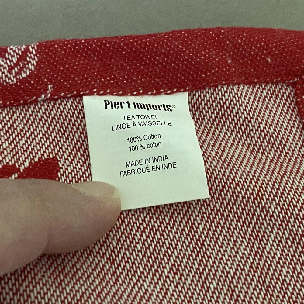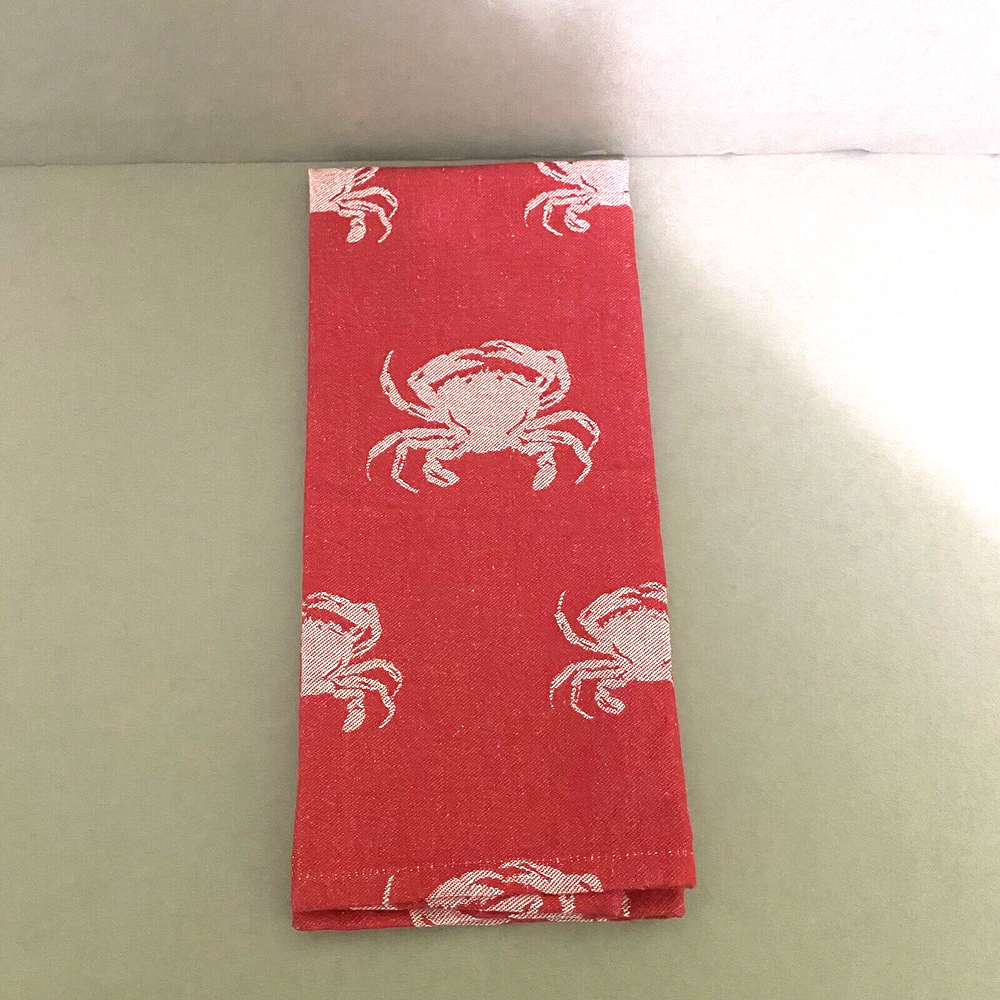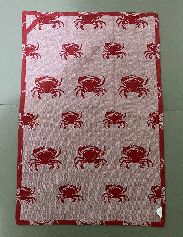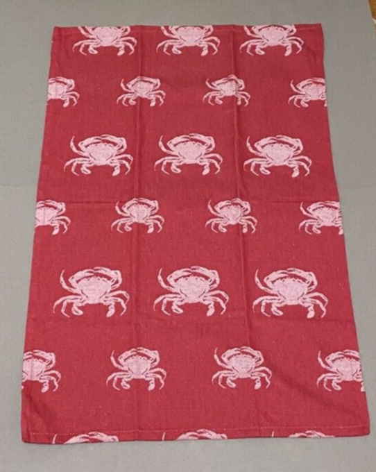 Up for your consideration is a new Pier 1 Imports 100% cotton kitchen or tea towel in red with a woven design of white crabs. The back of the towel has the opposite - whitish with red crabs. There is a strap sewn into the corner so that you could hang the towel when not in use. The tea towels measures 30 1/2 inches tall, measures 20 inches across, and weighs 4 3/8 ounces. The inside of the towel has a white label that reads: Pier 1 Imports - Tea Towel / Linge Vaisselle -100% Cotton / 100% coton - Made in India / Fabrique en Inde. There is also information about how to wash the tea towel. The tea or kitchen towel is in excellent, new condition, with no signs of wear or use. Please see all the photos. Thanks for looking!
