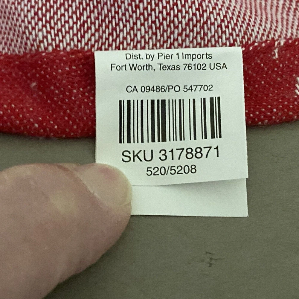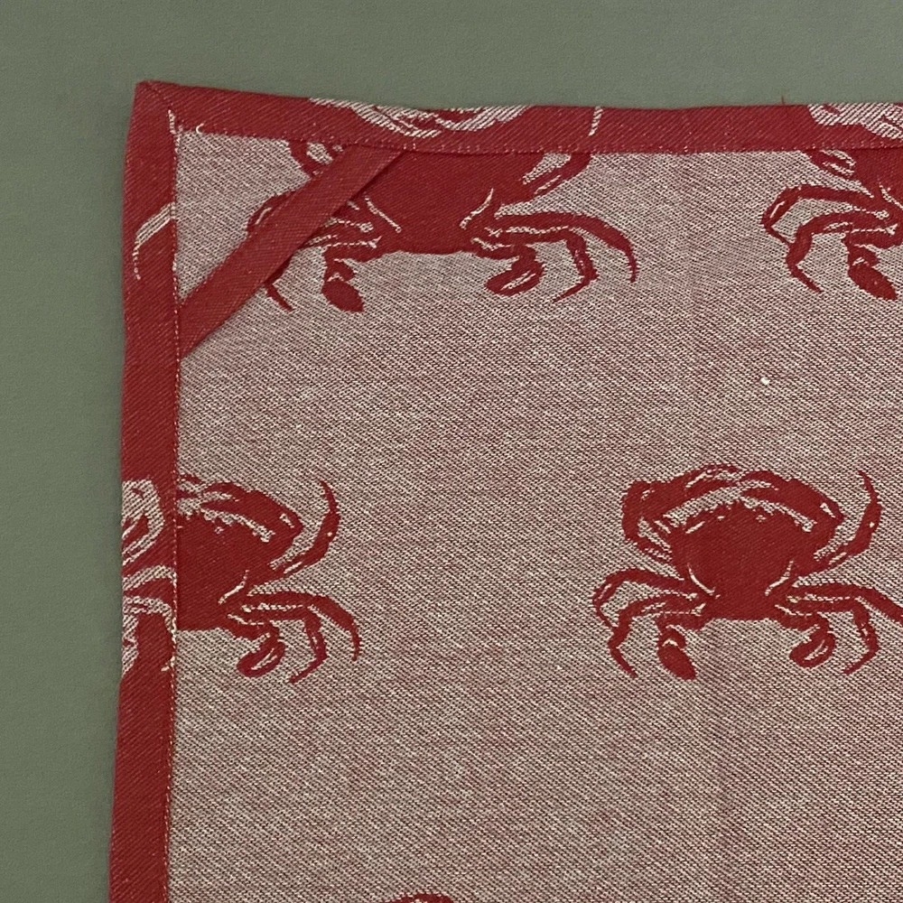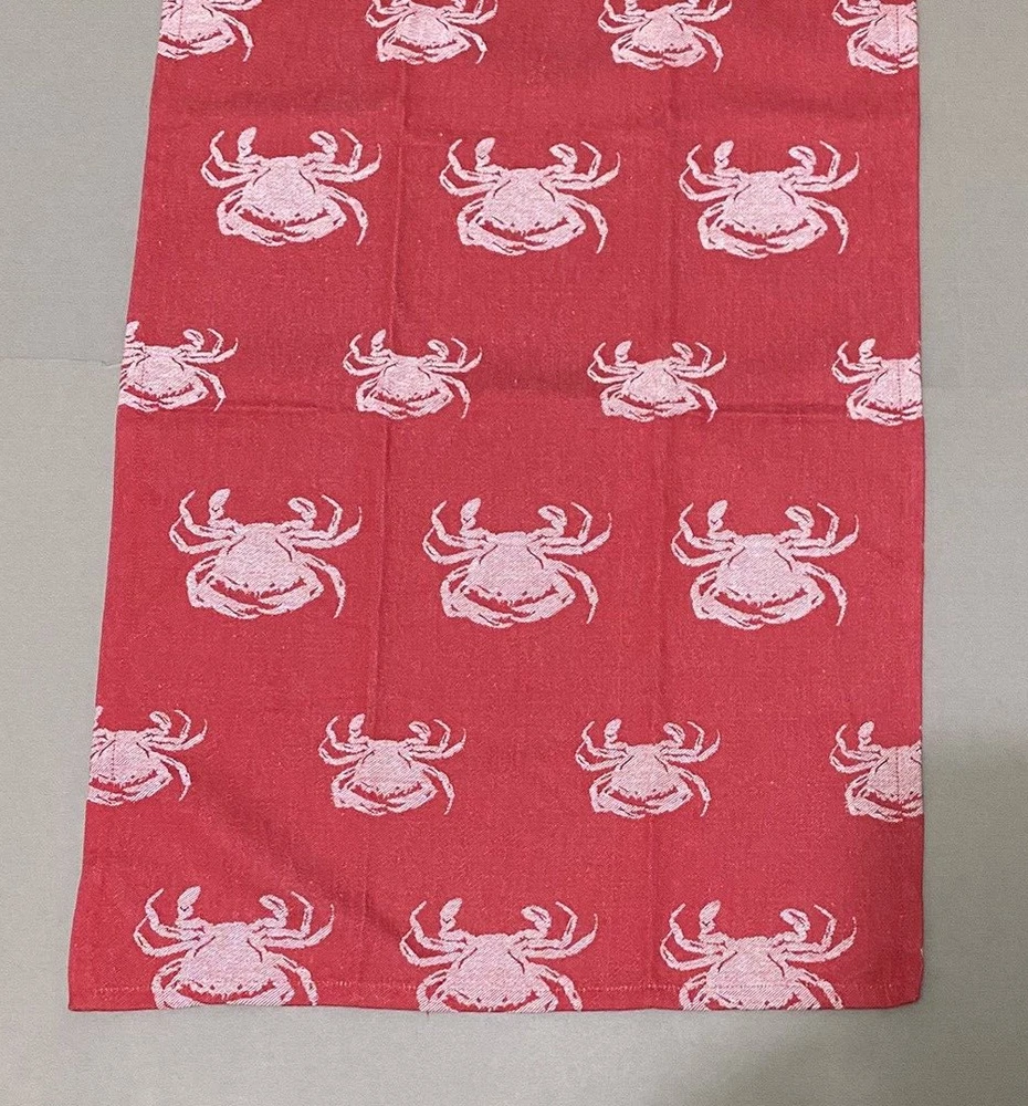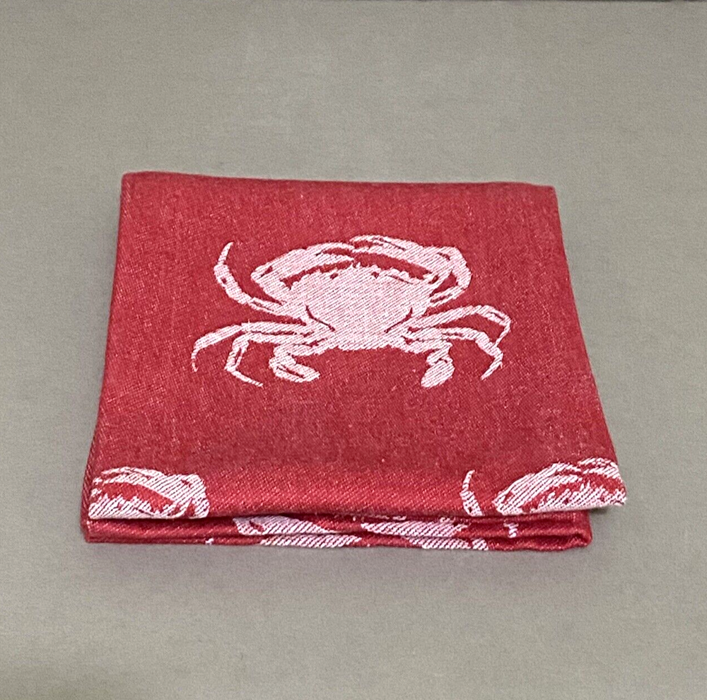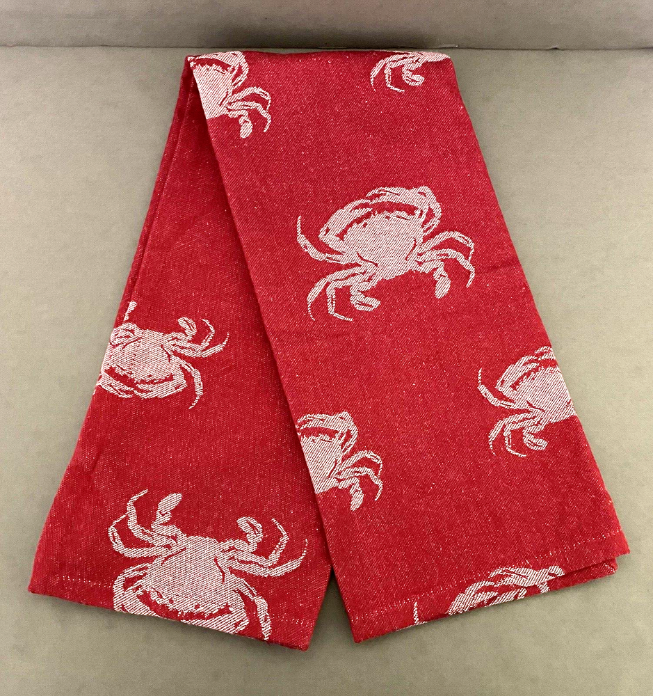Up for your consideration is a new Pier 1 Imports 100% cotton kitchen or tea towel in red with a woven design of white crabs. The back of the towel has the opposite - whitish with red crabs. There is a strap sewn into the corner so that you could hang the towel when not in use. The tea towels measures 30 1/2 inches tall, measures 20 inches across, and weighs 4 3/8 ounces. The inside of the towel has a white label that reads: Pier 1 Imports - Tea Towel / Linge Vaisselle -100% Cotton / 100% coton - Made in India / Fabrique en Inde. There is also information about how to wash the tea towel. The tea or kitchen towel is in excellent, new condition, with no signs of wear or use. Please see all the photos. Thanks for looking!