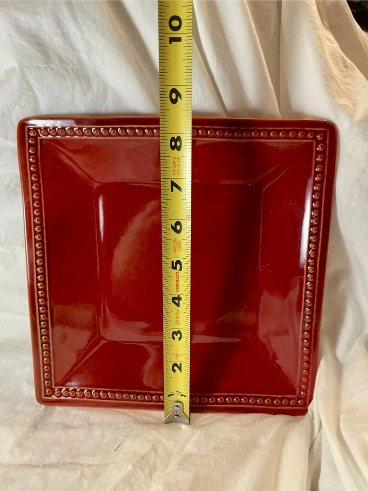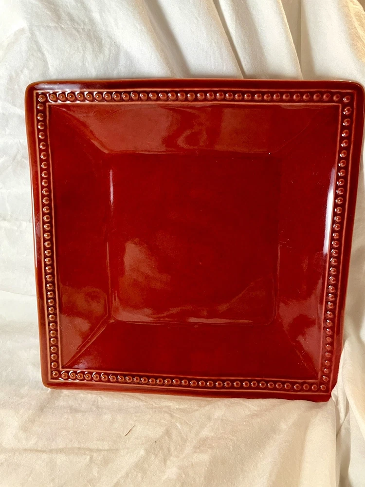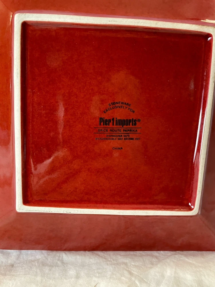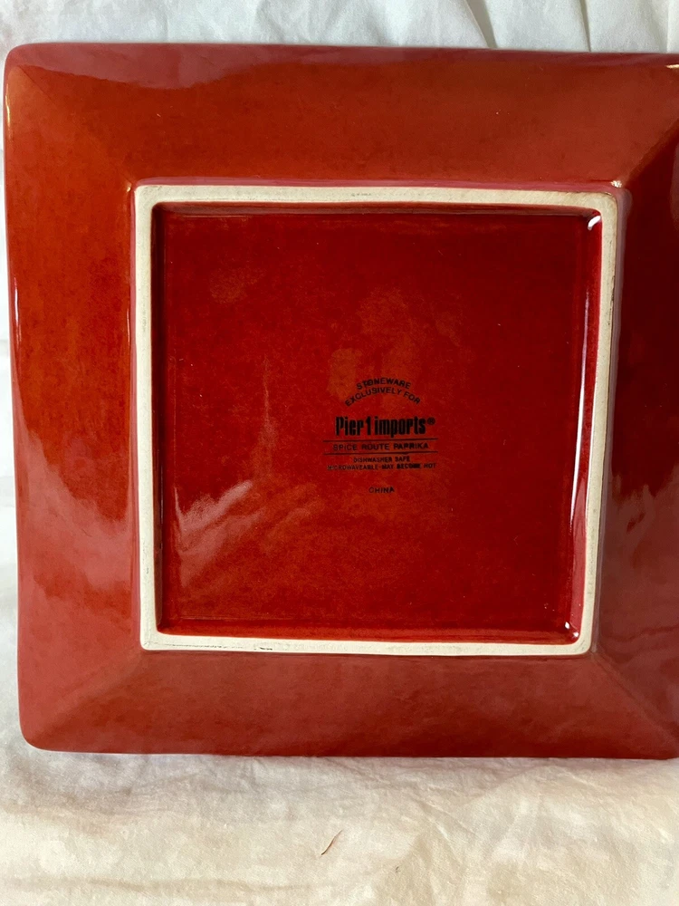 Add a touch of eclectic charm to your dining table with these Pier 1 Spice Route Paprika salad plates. The glossy red stoneware plates feature a beaded edge design and are perfect for all occasions. Crafted in China using pottery production techniques, these 8.25 inch square plates are original and dishwasher safe. They also feature a microwave safe design, making them a convenient addition to your dinnerware collection. The Pier 1 Spice Route product line is known for its unique and stylish designs, making these plates a must-have for any collector.