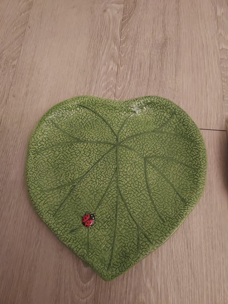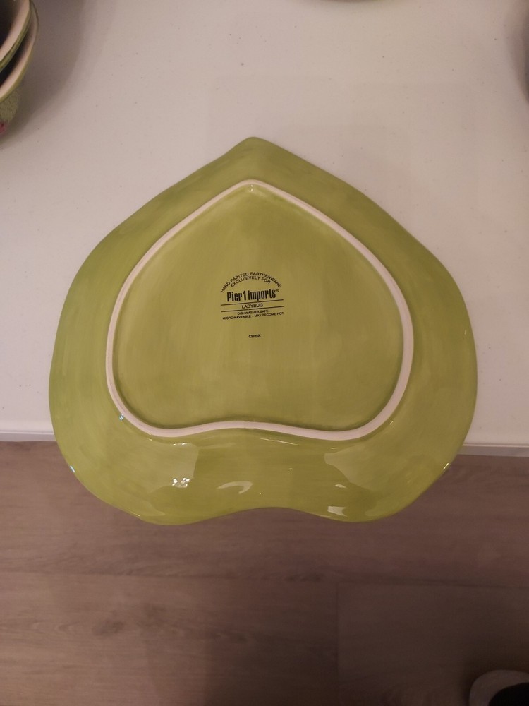 New~Pier 1 Imports~Ladybug Leaf Shaped Plate Set Of Two~MINT Condition. Up for sale is Pier one ladybug plates hand painted by Earthenware. These plates are rare and have been discontinued. The plates themselves are in mint condition and were well cared for by the previous owner. The plates feature a textured leaf surface with a ladybug resting on the leaf. The plate is beautifully hand painted in green with the red and black ladybug. Each plate has the printed Pier One logo on the back. The plates are free from chips, cracks, and repairs. See photos for further examination. The plates will be bubble wrapped and packed in a corrugated box. Item can be shipped or local pickup.
