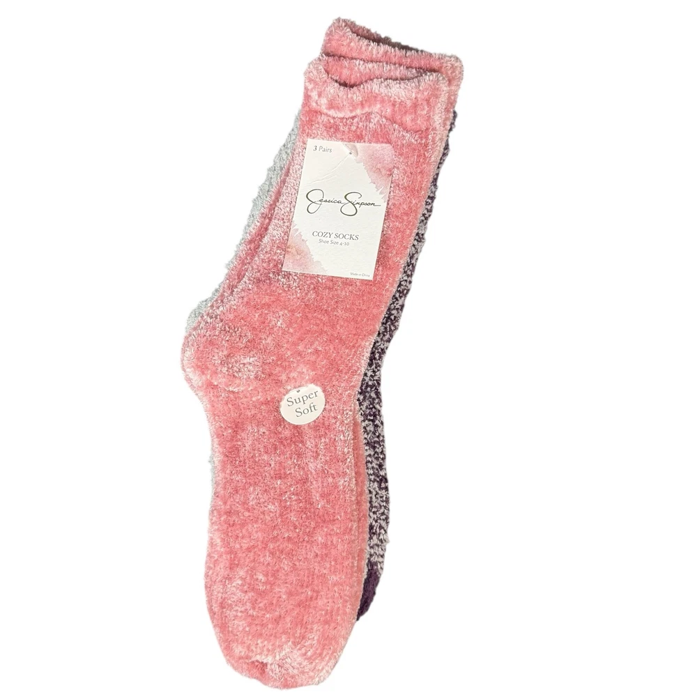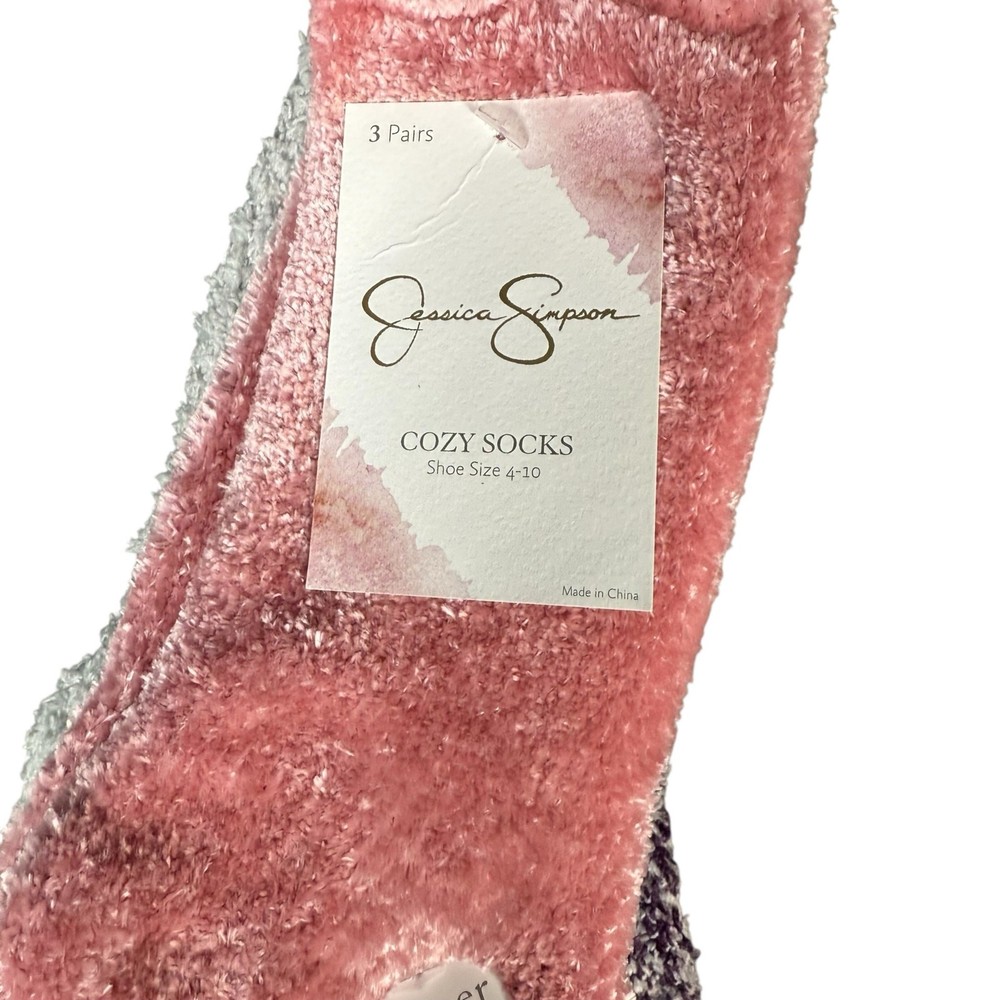 <![CDATA[<div>Brand New Set of 3 Jessica Simpson Fuzzy Socks Pink, Gray and Purple Size 4-10 Cozy Comfy Lounge - Women’s Size 4-10 - 1 Pair is Pink (Dusty Rose) - 1 Pair is Light Gray - 1 Pair is Purple and White - Super Soft -Tags: Cozy, Comfy, Cabincore, Winter, Lounge, Casual, Fuzzy * New with Tags. Never Worn. Comes from a smoke-free home. See photos for details.