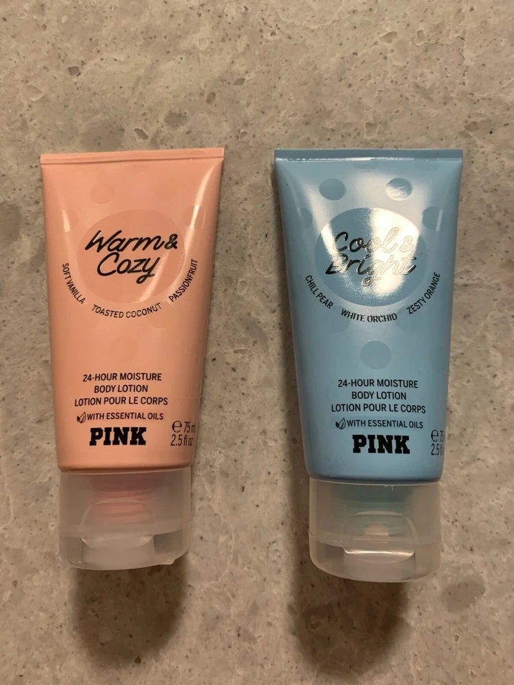 Victoria's Secret New Victoria's Secret PINK 24-Hour moisture body lotion travel size mini (2.5 fl oz/75 ml) in your choice of: Warm and Cozy Cool and Bright Comes from a smoke free and pet free home.