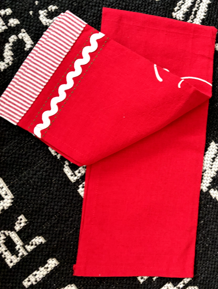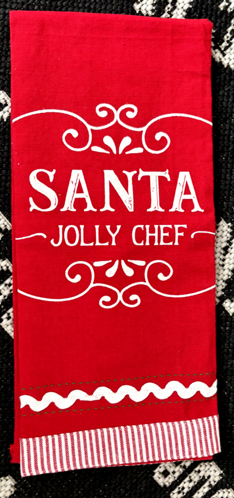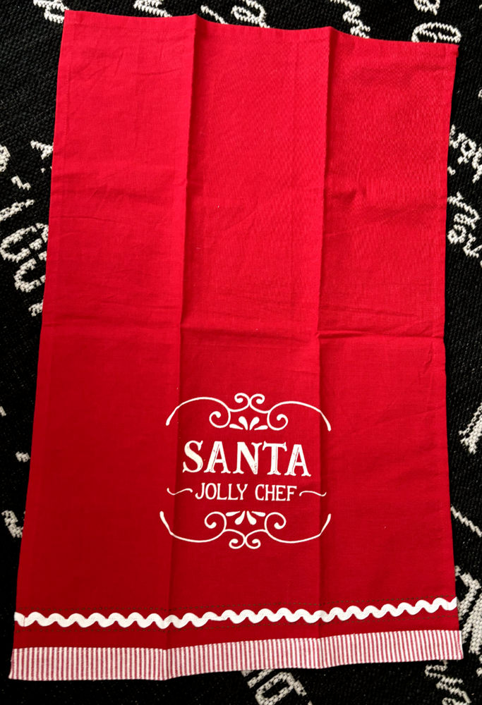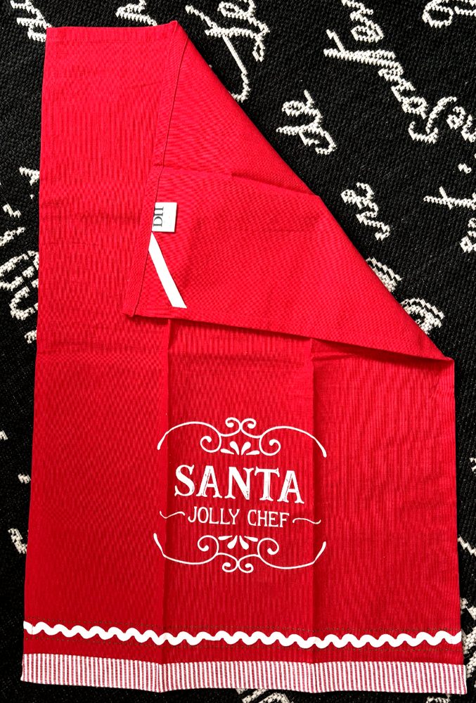 VINTAGE DESIGN IMPORTS SANTA JOLLY CHEF 100% COTTON KITCHEN TEA TOWEL New without tags 100% cotton Large rick rack detail with green embroidered stitching surround Red white stripe hem Reads: SANTA JOLLY CHEF Measures about: 19" X 28" Hanging loop Superior quality! SHIPPING TIME: We ship within 24 business hours of receiving your payment. INTERNATIONAL SHIPPING: Shipping is shown for First Class International. COMBINED SHIPPING: We are always glad to combine auction purchases to save you on shipping. 0.3