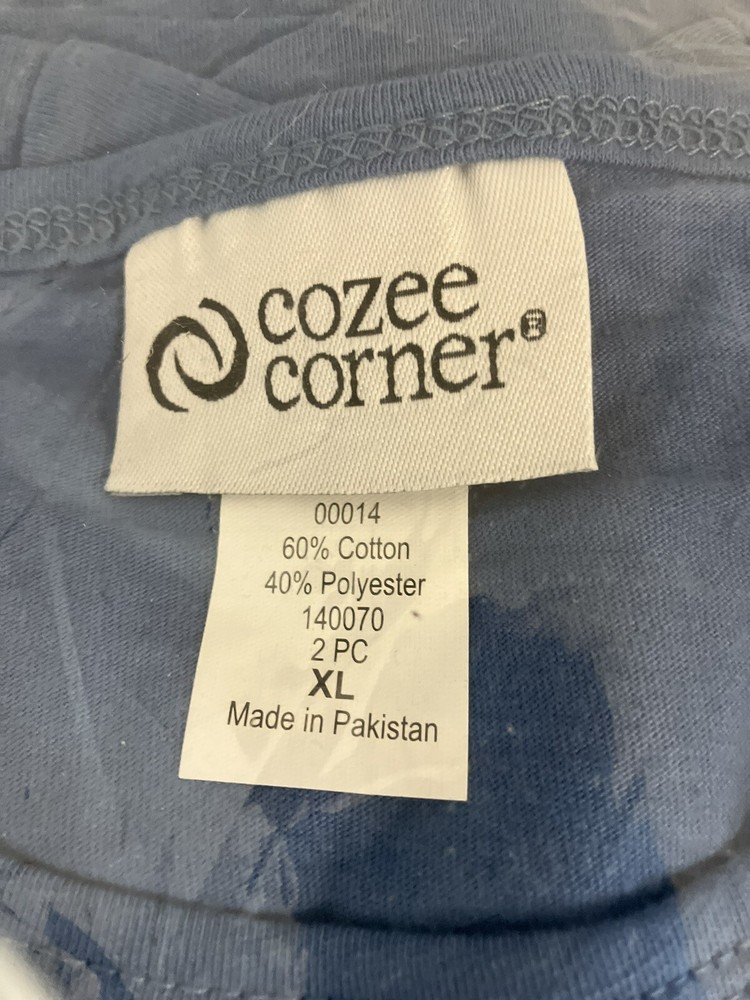 This Cozee Corner pajama set is perfect for staying comfortable and stylish all night long. The set includes a top and bottom in a beautiful blue/topaz color combination, both in size XL. The geometric pattern adds a touch of elegance to this winter and fall season pajama set. The round neckline and plus size type make this set perfect for any woman looking for a comfortable and flattering sleepwear option. It's also machine washable for easy maintenance. Get ready for a cozy night in with this Cozee Corner pajama set.