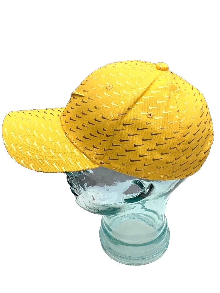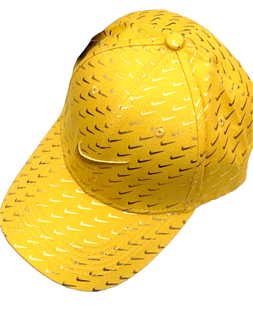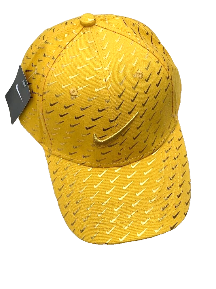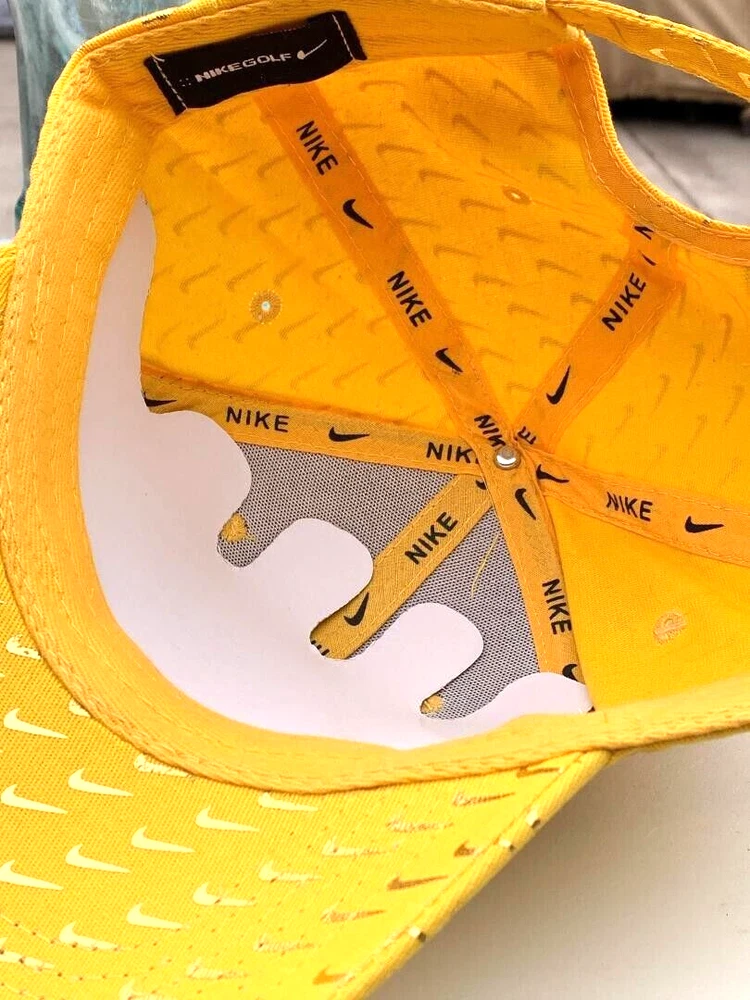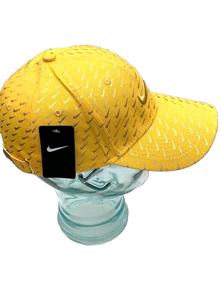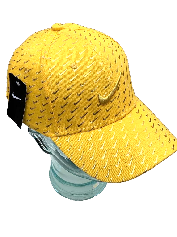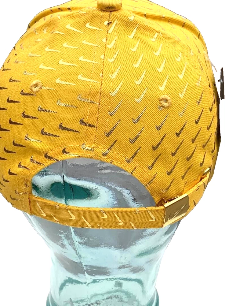 Offering a Nike 6 panel Gold baseball/golf Concept cap with a large Embroidered Gold swoosh logo on crown with numerous mini swooshs all over. C urved brim. One size fits most. A Swoosh-branded metal tri-glide lets you adjust your fit with ease. E mbroidered eyelets. This black and gold cap is a lot of fun and looks very unique. Concept means that Nike never put this hat into production for the general population.