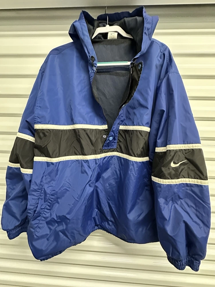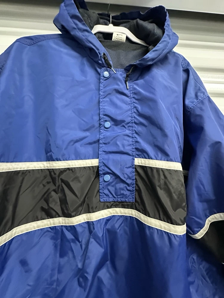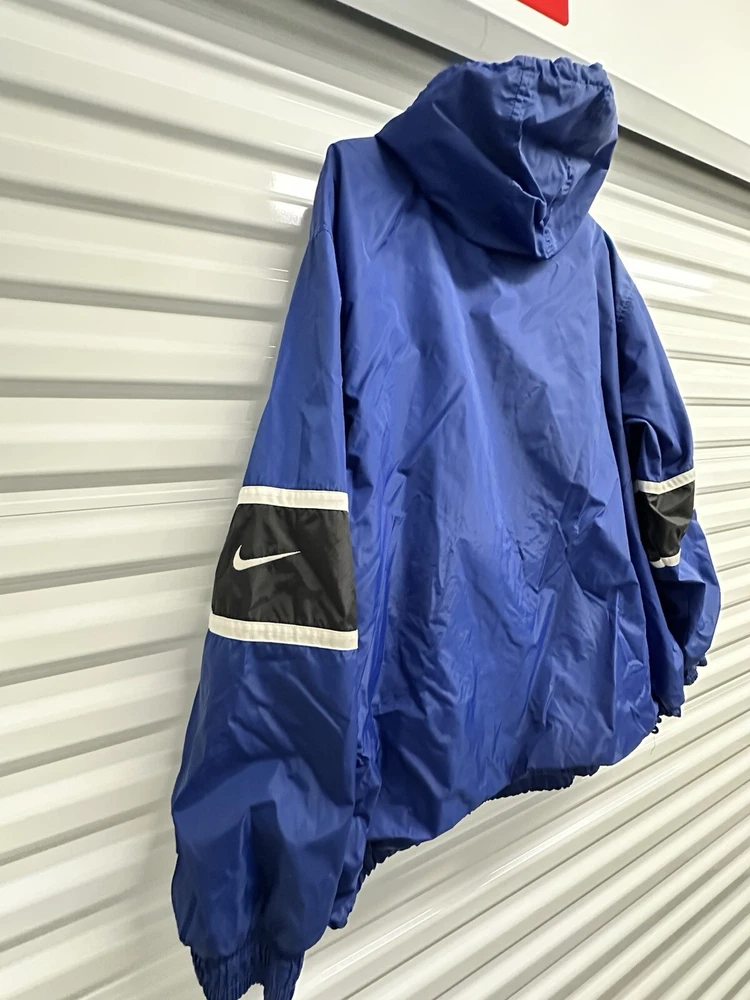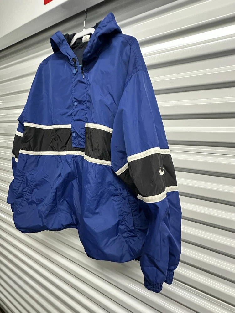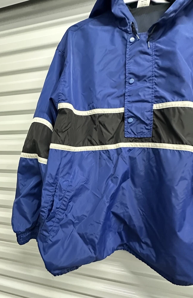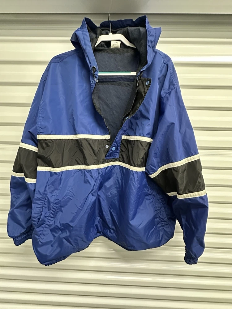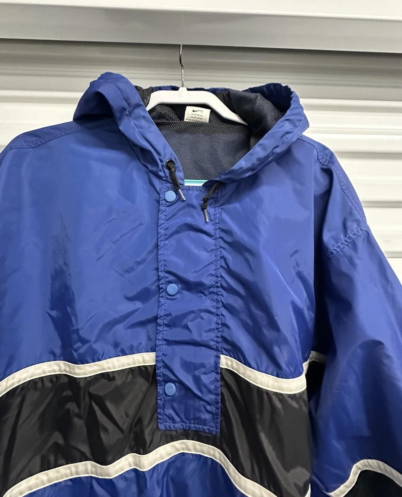 This Nike Men's Vintage 90s/y2k Hooded Windbreaker Jacket in size 2XL features a retro style with a solid blue, navy, and white color scheme. Made of nylon with polyester lining, it offers lightweight and wind-resistant protection. The jacket has a relaxed fit, elastic waist, and hood for added comfort, along with zip and button closures, embroidered accents, and the Nike logo. With features like a 1/4 zip, packable design, and multiple pockets, this versatile jacket is suitable for travel, casual wear, or workwear in various seasons.