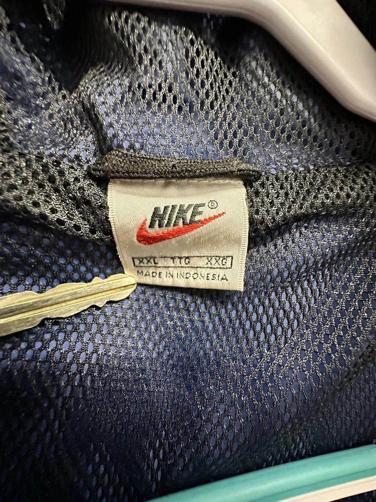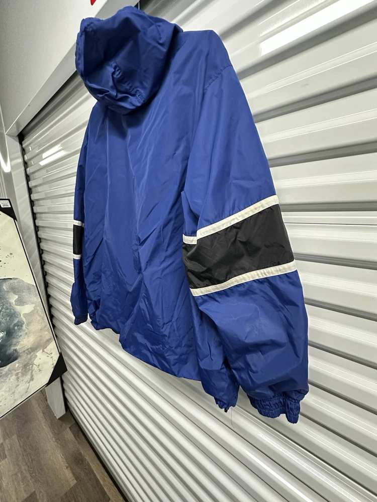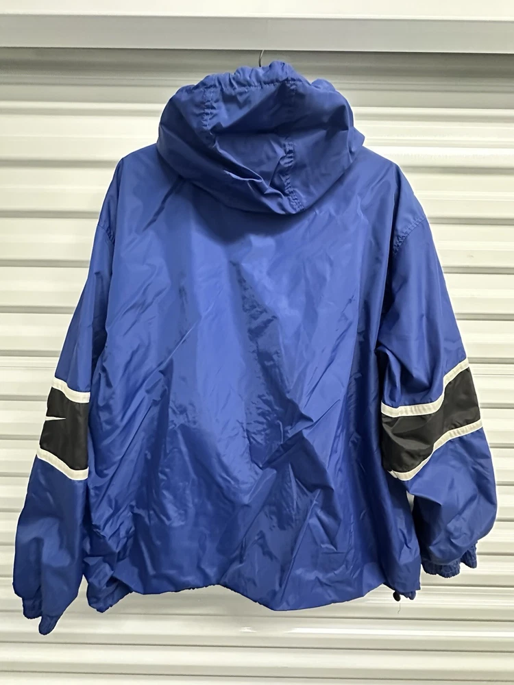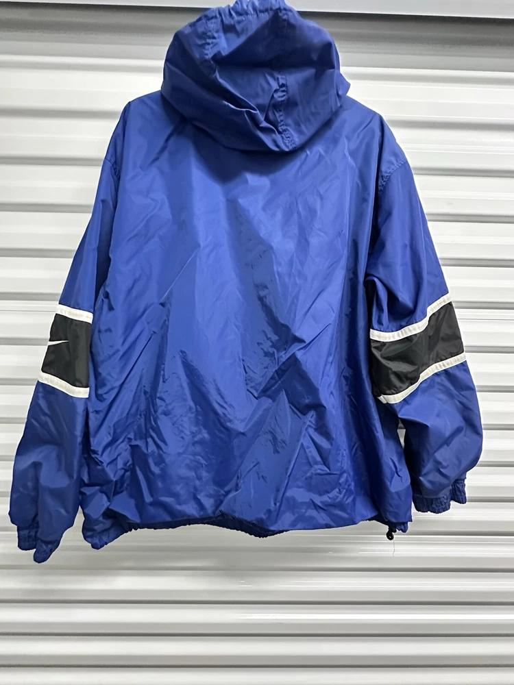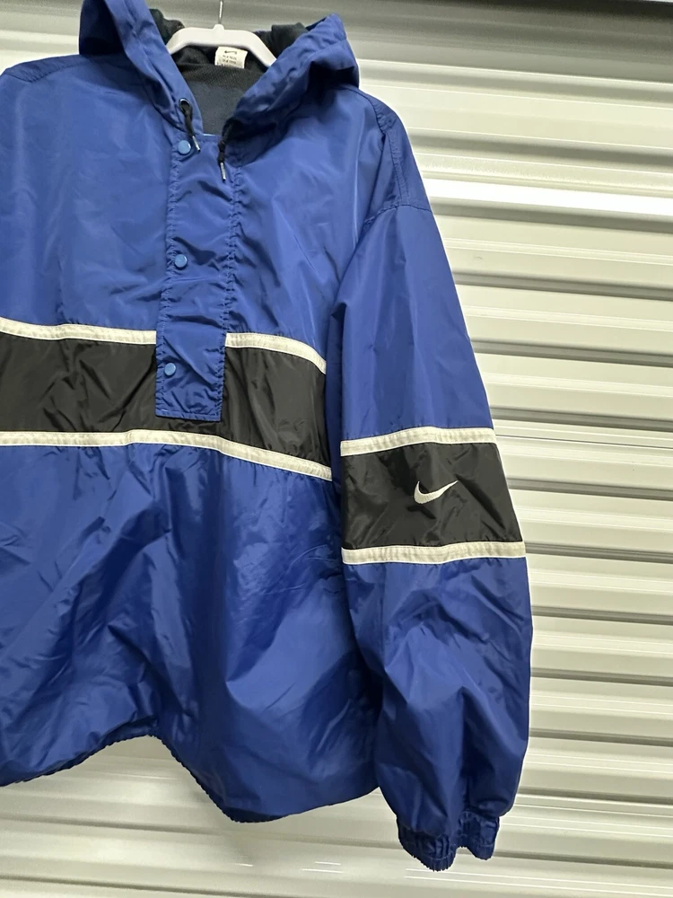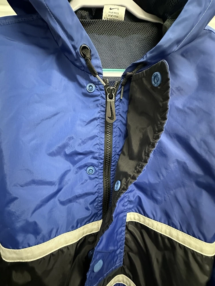 This Nike Men's Vintage 90s/y2k Hooded Windbreaker Jacket in size 2XL features a retro style with a solid blue, navy, and white color scheme. Made of nylon with polyester lining, it offers lightweight and wind-resistant protection. The jacket has a relaxed fit, elastic waist, and hood for added comfort, along with zip and button closures, embroidered accents, and the Nike logo. With features like a 1/4 zip, packable design, and multiple pockets, this versatile jacket is suitable for travel, casual wear, or workwear in various seasons.