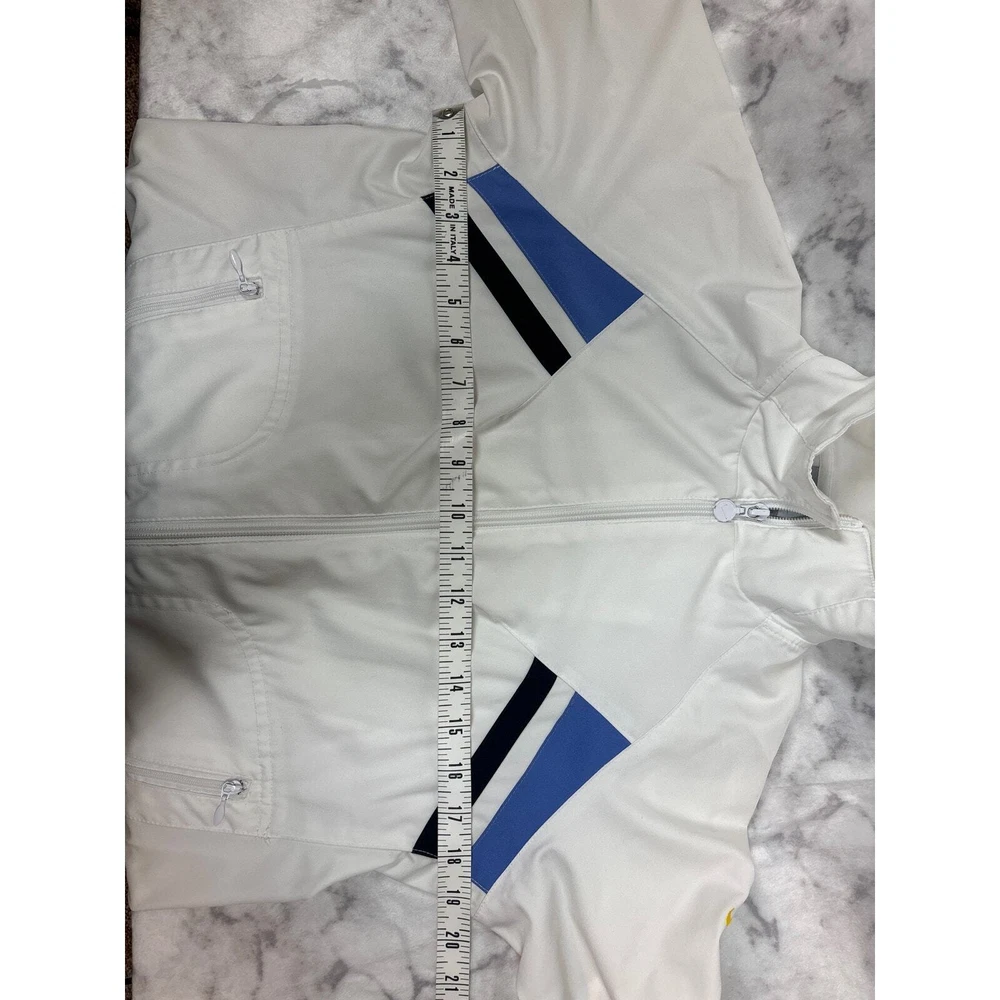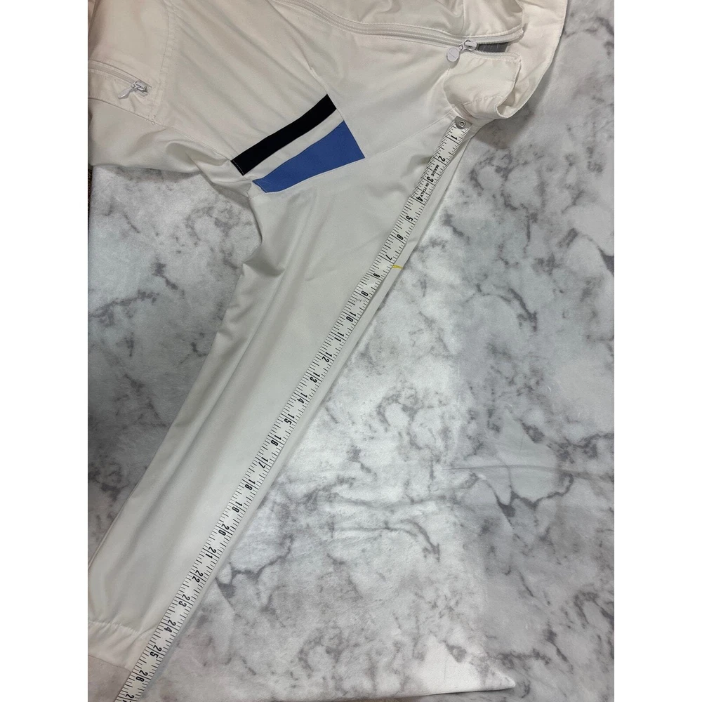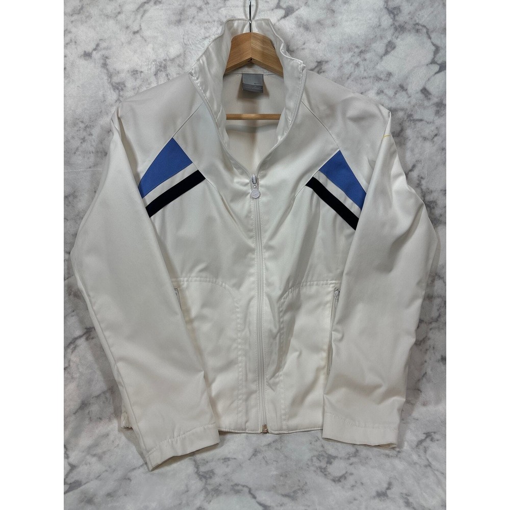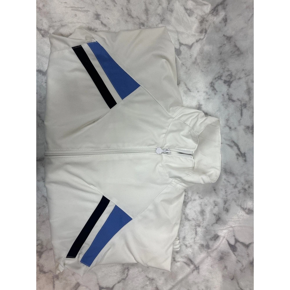 <![CDATA[<div>Great Pre Owned track jacket from early 2000's. Nice crisp white with blue and black stripes. Elastic and zippers in great working condition. This is a Play Up collab. Please see photos. Measurements are as follows: Overall length- 22.5" Hip- 19" Waist- 18" Arm length- 26" Armpit inside- 19.5"