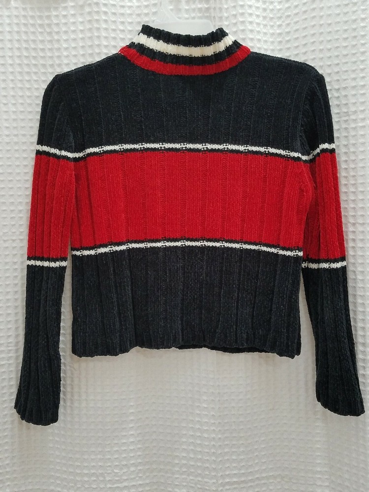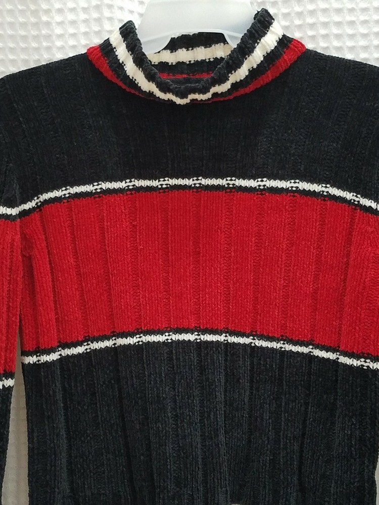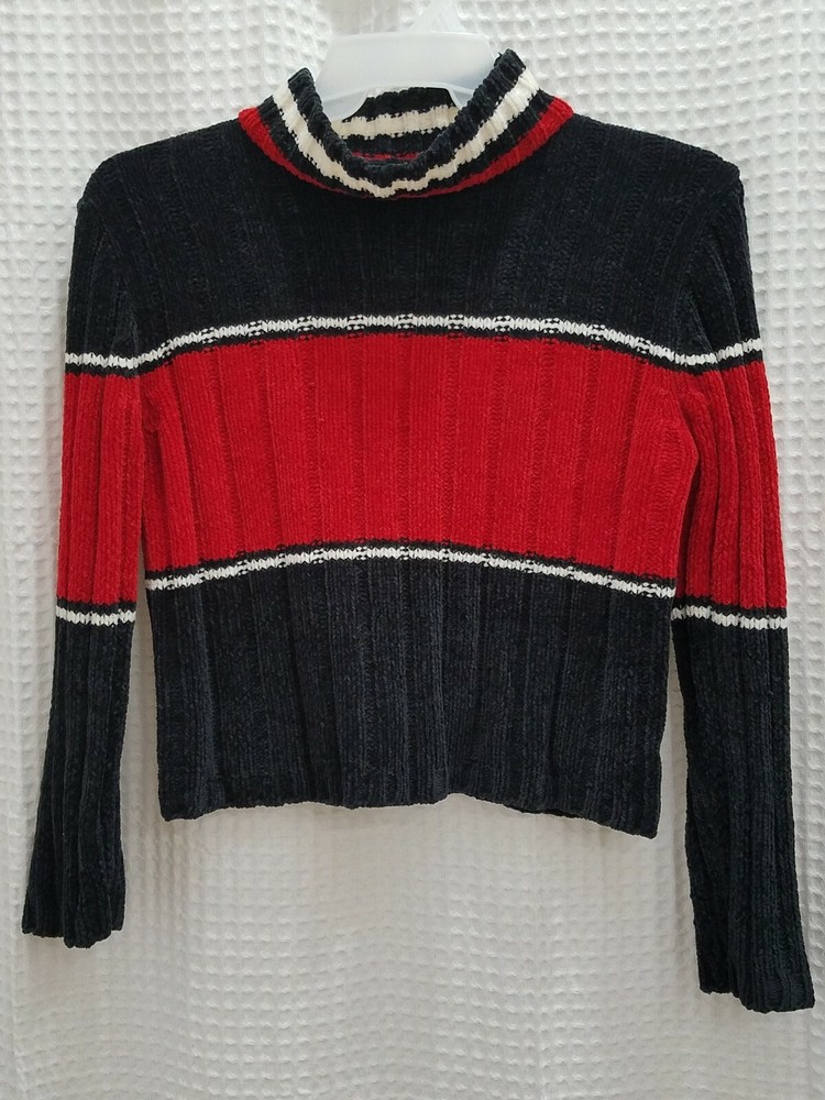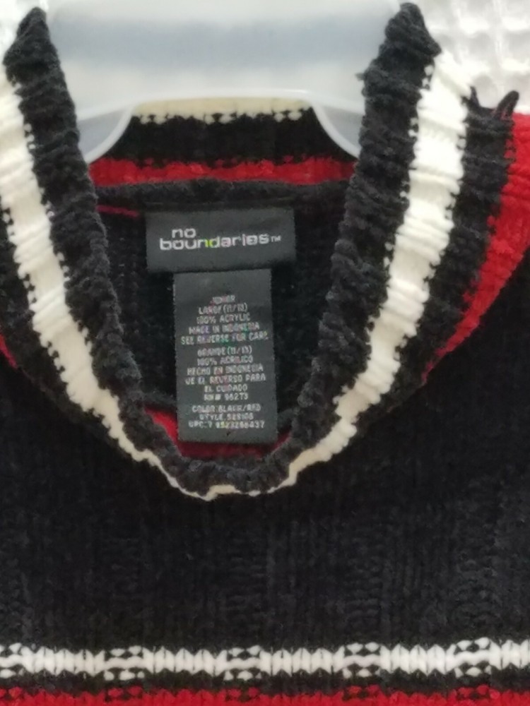 No Boundaries Juniors 11-13 Sweater Black Red Winter Soft Warm Cozy. Condition is gently Pre-owned. No defects noted. Please see photos for more details. Chest measures 19" and length is 20 1/2". Non smoking home. Shipped with USPS First Class Mail. Thanks for shopping. Check out our other items for sale to benefit charity.