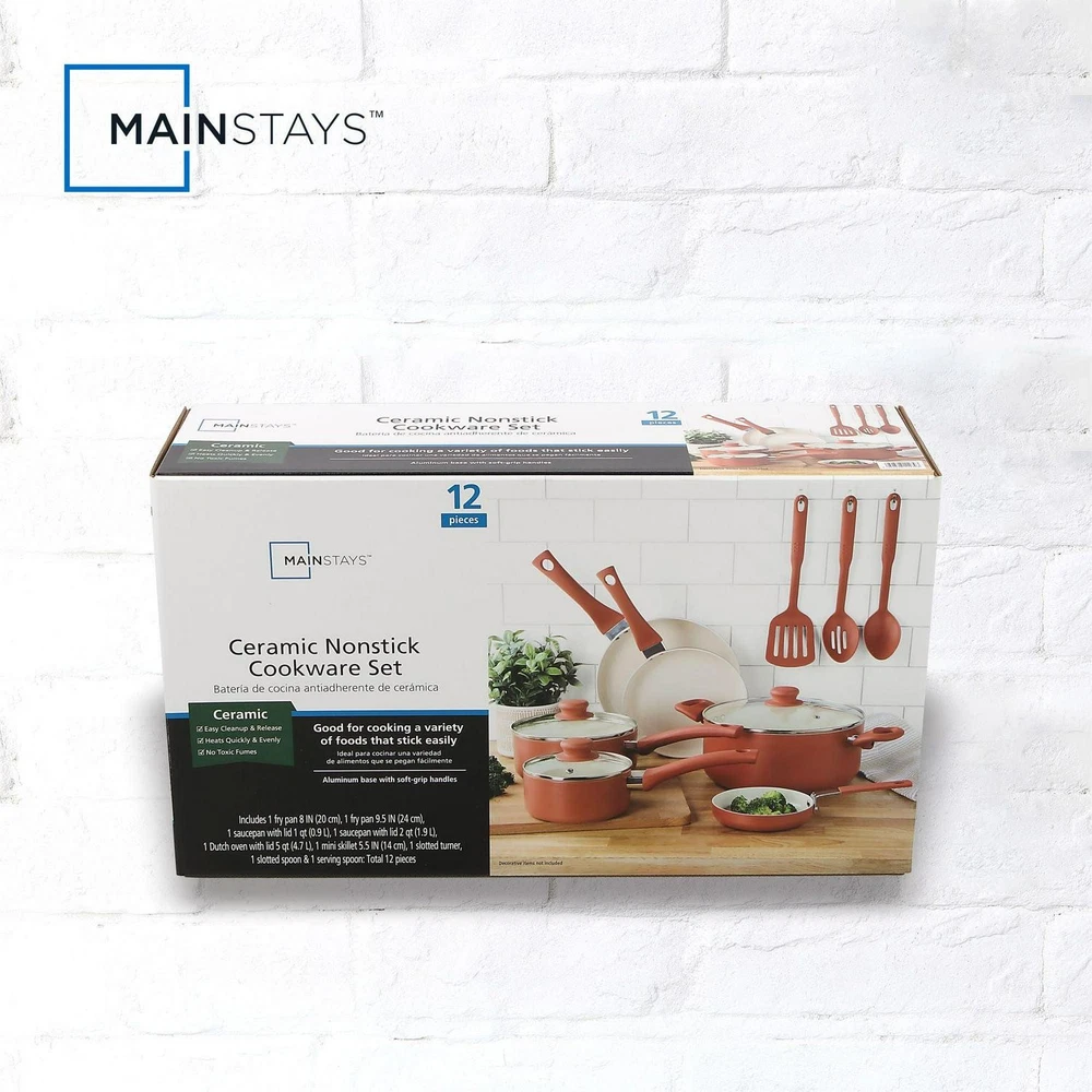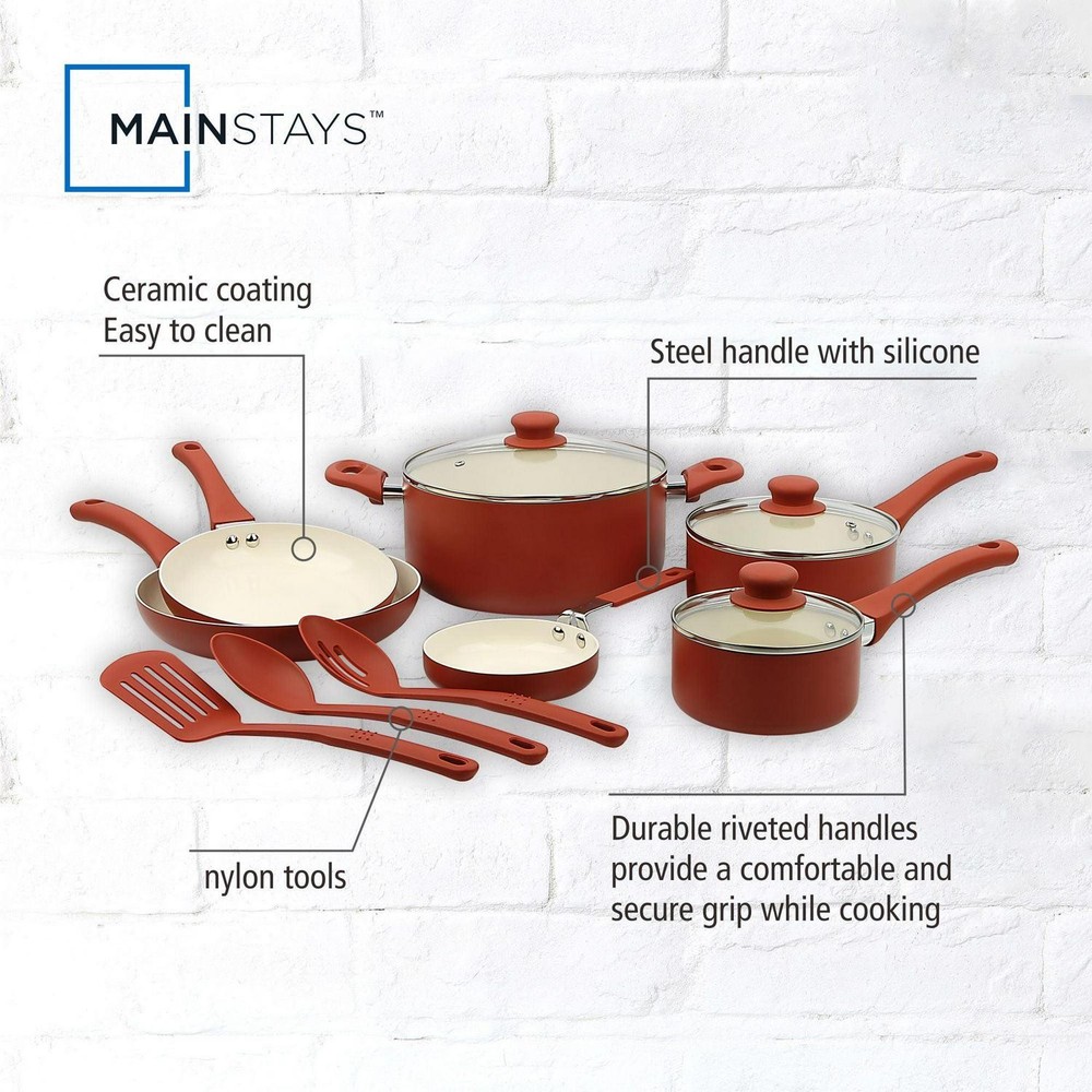 [BANNER] Mainstays Classic Collection 12 Piece Nonstick Aluminum Alloy Cookware Set, Red We're unable to ship to this item to homes in: AK, GU, HI, PR, VI Ideal for everyday use at home, this Mainstays ceramic 12 pieces set red canyon pans and kitchen utensils that can fulfill your everyday cooking needs at home. It is also ideal as a considerate and valuable gift to your close friends and family. The interior is coated with 2 layers of PPG Customized ceramic coating, which makes cooking and clean-up easy. The pans heat quickly and evenly due to the aluminum body, so this set will help you save time cooking as well. Cool, soft-touch handles provide a comfortable grip, while the outside color of this set will offer a bright pop of color to your kitchen. Mainstays Classic collection 12 Piece Nonstick Aluminum Alloy Cookware Set, Red - Aluminum body for fast and even heating - Riveted handles for a strong connection - Suitable for all cooktops except induction - a variety of pans and kitchen utensils for versatile cooking - Coated with 2 layers of PPG Customized ceramic coating for easy cooking and clean-up Brand: Mainstays Collection: Classic collection Piece Count: 12 Pan Material: Aluminum Alloy Handle Finish: Red Color: Red Features: Nonstick Manufacturer Part Number: MS55036109914AD Model: MS55036109914AD Assembled Product Dimensions (L x W x H): 22.44 x 12.99 x 6.41 Inches FEATURES: Aluminum body for fast and even heating Riveted handles for a strong connection Suitable for all cooktops except induction a variety of pans and kitchen utensils for versatile cooking Coated with 2 layers of PPG Customized ceramic coating for easy cooking and clean-up *Note: We use stock photos from the manufacturer. Exact model may vary in appearance. Item will generally be the newest model available. Read listing title and item description for item details. Please contact us if you have any questions. PAY SAFE: PAYPAL PAYMENT IS ACCEPTED PayPal is our preferred method of payments. It's the quickest, easiest and most secure way to pay for your goods or services online. PayPal offers buyer and seller protection should there be a problem. If you do not have a PayPal account, to get started and buy your first item with us is very easy. Simply click on the 'Buy It Now' button and follow the eBay checkout steps. Select PayPal as the payment method you then will be given the chance to enter your card details into PayPal's secure checkout in order to pay for your order. Once the payment has been made, you will then be given the opportunity to make your own PayPal account to make paying for your items in the future very easy. Should there be a problem with payment please do let us know. All domestic packages are shipped for Free (Unless another shipping method was selected during the checkout) We do not accept P.O. BOXES - PLEASE PROVIDE A PHYSICAL ADDRESS We offer a 30-day return policy for our products. All returns must be done within 30 days of the date of purchase. Please note that we cannot give refunds after the 30-day limit has expired. When sending in a return, please note that it can take up to 7 business days for the return to be processed. We do our best to process as quickly as possible. If you have any questions please contact us through "Ask seller a question" link. We will respond within 1 business day or less.