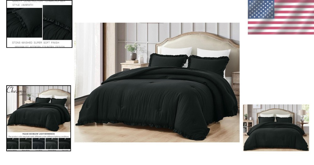 Nora Black Comforter Set - 3-Piece Stone-Washed Microfiber Full Size Luxury ‹ › ‹ › ‹ › ‹ › ‹ › ‹ › ‹ › ‹ › ‹ › ‹ › Nora Black Comforter Set - 3-Piece Stone-Washed Microfiber Includes: 1 Comforter, 2 Shams Full Size Measurements: Comforter 86" x 86", Shams 20" x 26" +2" Features: Indulge in luxurious comfort with a vintage ruffled edge trim pattern. Unique stone-washed process for a charmingly weathered appearance. Luxuriously smooth and silky microfiber fabric for optimal warmth without the weight. Machine washable for easy care - tumble dry low, do not bleach. Made in OEKO-TEX Standard 100 factory, ensuring safety and environmental standards. Benefits: Transforms your bedroom with sophisticated elegance. Meticulous attention to detail offers a cozy and inviting atmosphere. Whimsical ruffled edge trim adds a delightful touch of charm. Resilient against wrinkles, fading, and shrinking for lasting beauty. Available in a range of timeless colors to suit any decor style. Why choose the Nora Black Comforter Set? Elevate your sleep sanctuary with the Nora Black Comforter Set, where vintage charm meets contemporary functionality. Created with a stone-washed microfiber fabric, this bedding set offers not just aesthetic appeal but also the luxurious comfort you deserve. Its lightweight yet cozy design ensures that you stay warm through all seasons, while the exquisite ruffled edges add an element of sophistication to your space. This comforter set is not merely bedding; it’s a transformative experience that augments your bedroom's allure. Ideal for master suites, guest rooms, or charming cottages, the Nora Black Comforter Set invites you to create a restful haven filled with vintage shabby chic charm. Don't just dream of luxury; embrace it and redefine your space with this exquisite comforter set! Order yours today and experience the difference. Shipping Free & Fast Shipping - We offer free shipping to most of the USA with a normal delivery time of 3-7 days. However, due to the current situation, additional delivery time (up to 3 weeks) may be required for some items. Alternative Carriers - We may use alternative carriers (e.g. USPS, FedEx, UPS, etc.) to ensure your package arrives safely and on time. Due to the use of multiple carriers, we are unable to provide a tracking number automatically. Handling Time - Orders are processed and shipped within 1-2 business days of receiving cleared payment. Shipping Restrictions - Shipping to Alaska, Hawaii, Puerto Rico, Guam, and other US territories may incur shipping charges or delivery restrictions. Please contact us before ordering, or your order can be refunded/cancelled. State Restrictions - There may be restrictions based on your state of purchase. For example, certain items may not be shipped to California due to state regulations. Contact for Tracking Updates - If you require tracking updates or have any concerns about the delivery of your order, please feel free to contact us, and we will be happy to assist you. Return 30-Day Hassle-Free Returns - We want you to be completely satisfied with your purchase. If you are not, you can return the item within 30 days of receiving it for a full refund or exchange. Easy Return Process - To start a return, simply contact us and we will provide you with a prepaid return shipping label and detailed instructions. Restocking Fee - There are no restocking fees for returns. However, the buyer is responsible for return shipping costs if the return is not due to a seller's error. Refund Processing Time - Refunds will be processed within 5 business days of receiving the returned item in its condition. Payment We accept all major credit cards, PayPal, and Apple Pay for your convenience. Your payment information is secure and encrypted to ensure a safe and seamless transaction. Please complete your payment within 3 days of purchase to avoid any delays in shipping. Feedback Your feedback is extremely important to us. We strive to provide the best products and customer service possible. If you are satisfied with your purchase, please take a moment to leave us a positive review. If you have any concerns or issues with your order, please contact us before leaving negative feedback. We are committed to resolving any problems and ensuring your satisfaction. Contact Us If you have any questions or concerns, please feel free to out to our customer support team. You can contact us through the eBay messaging system. We are available Monday to Friday, 9:00 am to 5:00 pm EST, and we will do our best to respond to your inquiry within 24 hours. Buy it now and enjoy a pleasant shopping experience! Set Includes: Comforter,Pillow Sham Material: Microfiber,100% microfiber polyester,polyester Features: Lightweight,Fluffy,Soft,Easy Care,Machine washable,Comfortable Theme: Luxury Care Instructions: Do Not Bleach,Machine Wash Cold,Tumble Dry Low Department: Unisex Baby & Toddler,Kids,Teens,Adults Room: Bedroom Size: Full Type: Comforter Set Color: Black Fill Material: Polyester Pattern: Solid Insulation: All Seasons Number of Items in Set: 3 Style: Shabby Chic Season: All Closure Type: No Closure Thread Count: Unknown GSM (Grams per Square Meter): Unknown