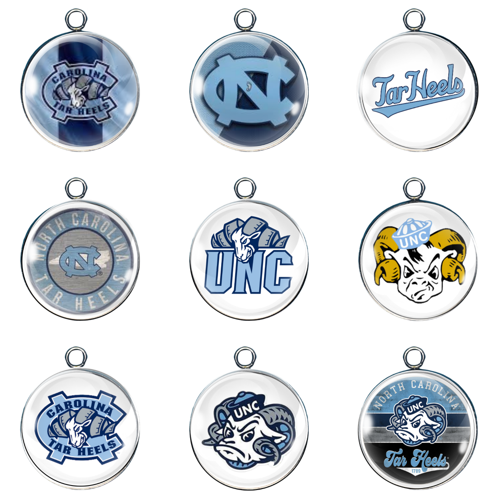 At I Like Worms, We make our North Carolina Tar Heels charms with glass cabochons and they are set in a stainless steel base. We make these Charms and pendants in three different sizes. * Small -14mm(1/2") - good size for Earrings * Medium - 18mm(3/4") - good size for Bracelets * Large - 25mm(1") - good size for Necklaces These wonderful Photo Glass cabochon charms and pendants are great for making Necklaces, Bracelets, Earrings, Bookmarks, Zipper pulls, Hat Pins, Lapel Pins, Magnets, Key Tags, Purse Danglers, DIY Crafts and so much more... The possibilities are endless with these charms so let your creativity run wild! " CLICK ON THE STYLE# TO SEE THE CORRESPONDING IMAGE"