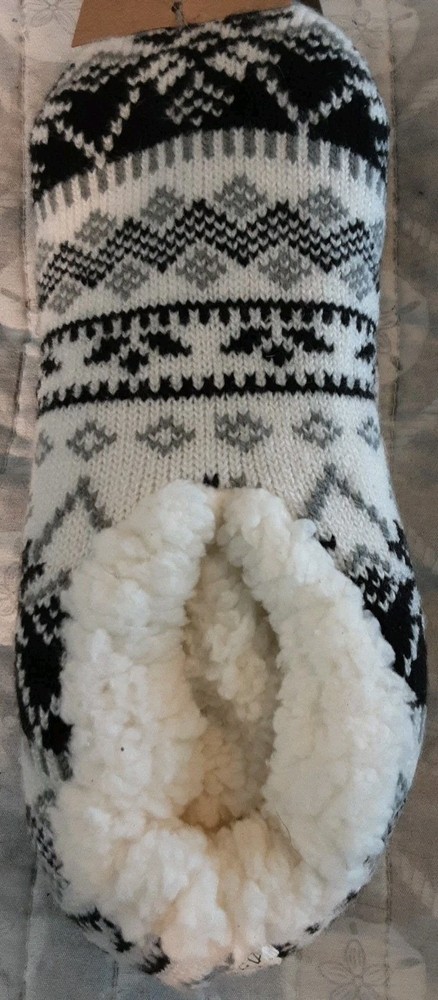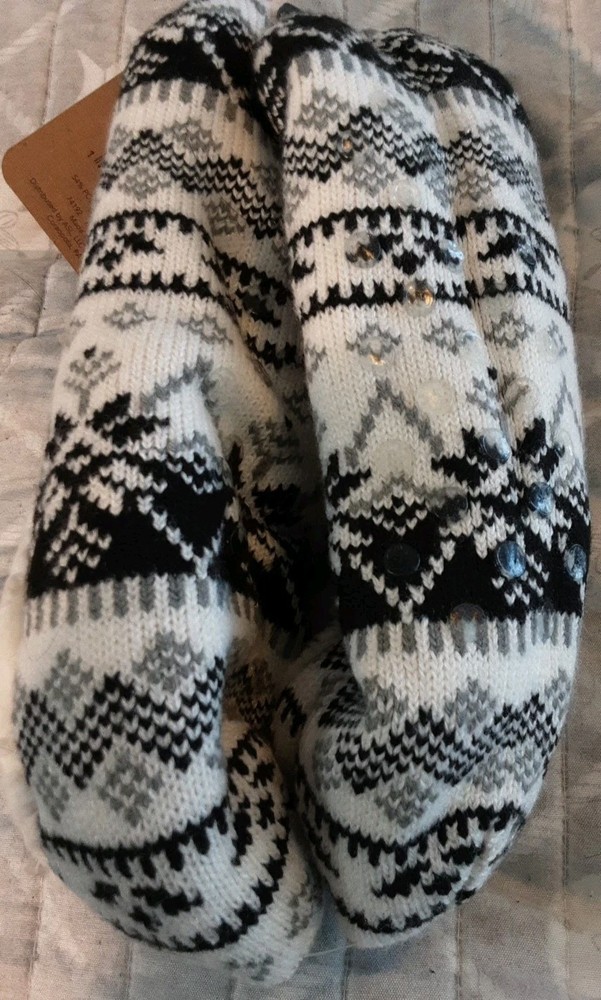 Northeast Outfitters Women's Cozy Cabin Slippers in Size Small feature a black and white snowflake fair isle pattern. These slip-on slippers have a no-slip sole, making them ideal for winter, fall, and spring wear. The lightweight and breathable design, with an acrylic upper and polyester lining, ensures comfort for unisex adults. Perfect for a cozy and stylish look at home.
